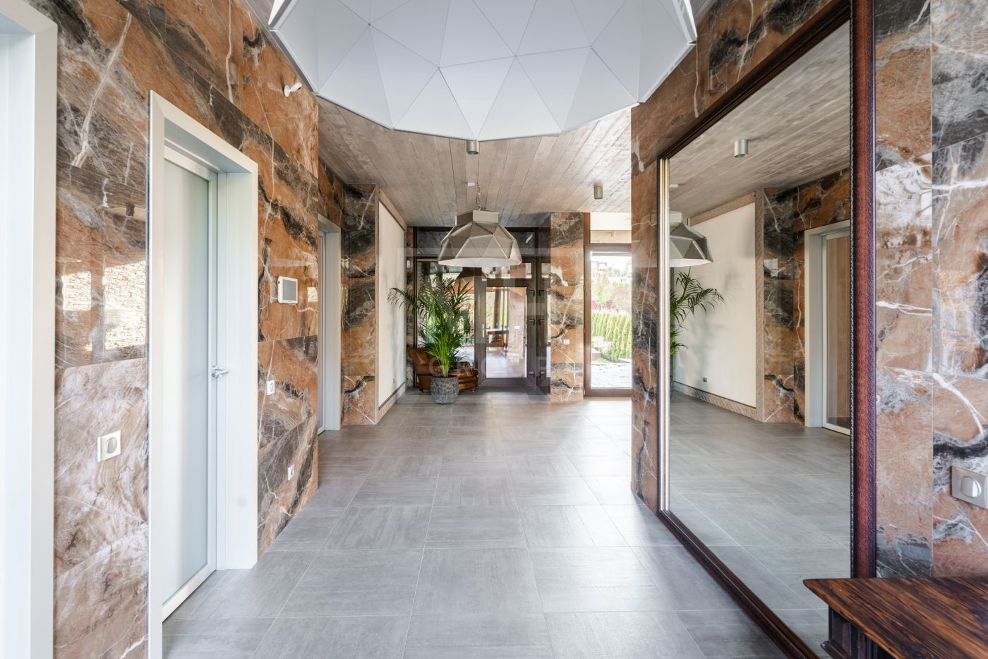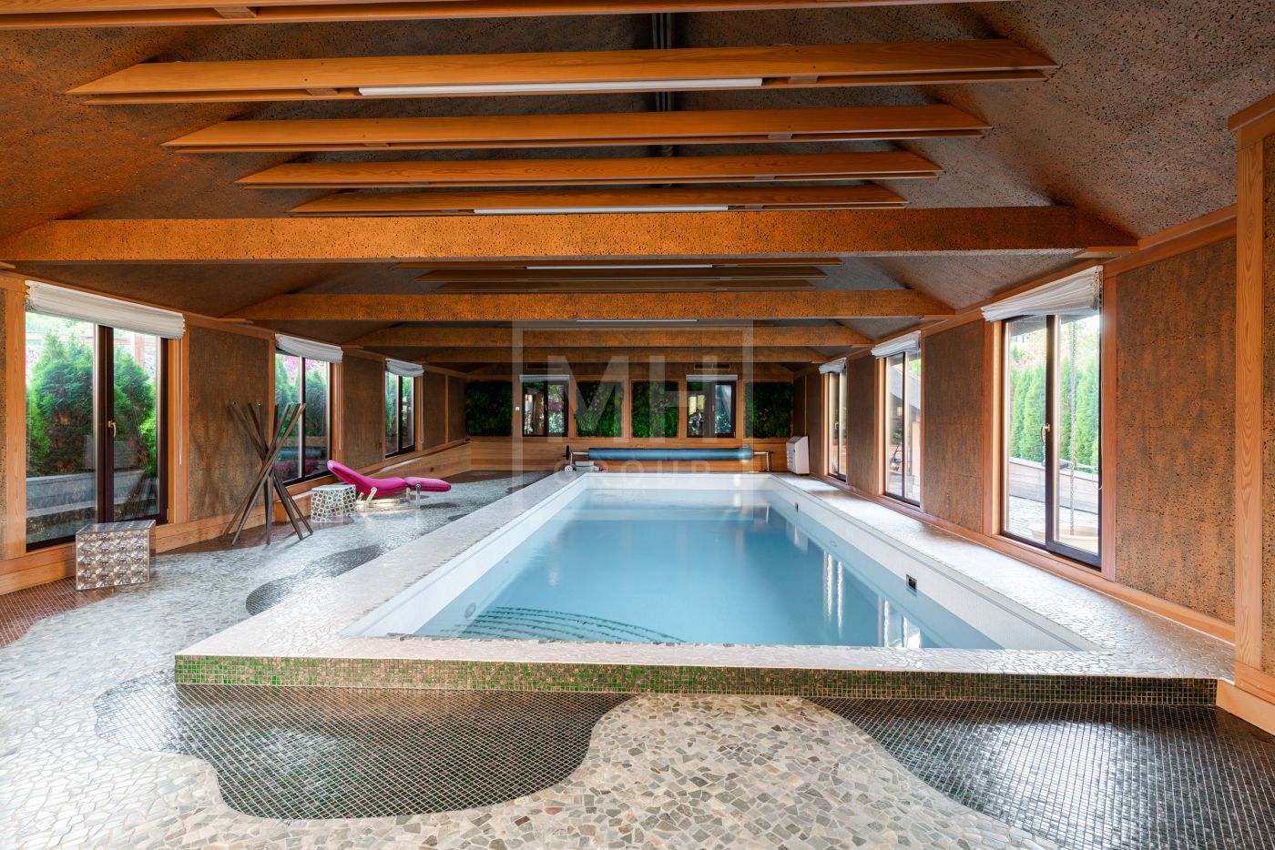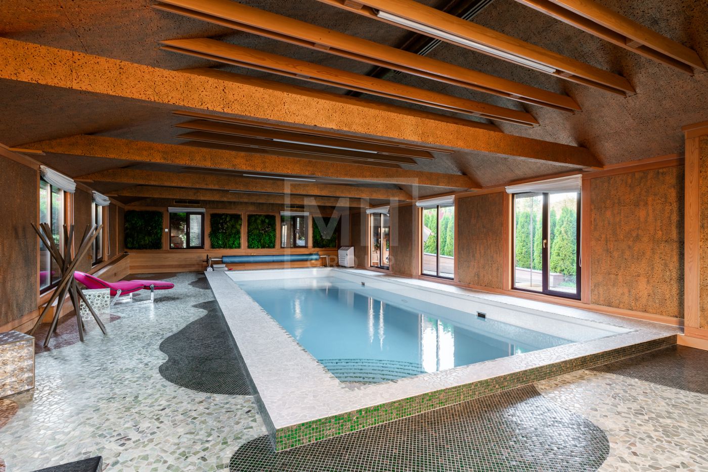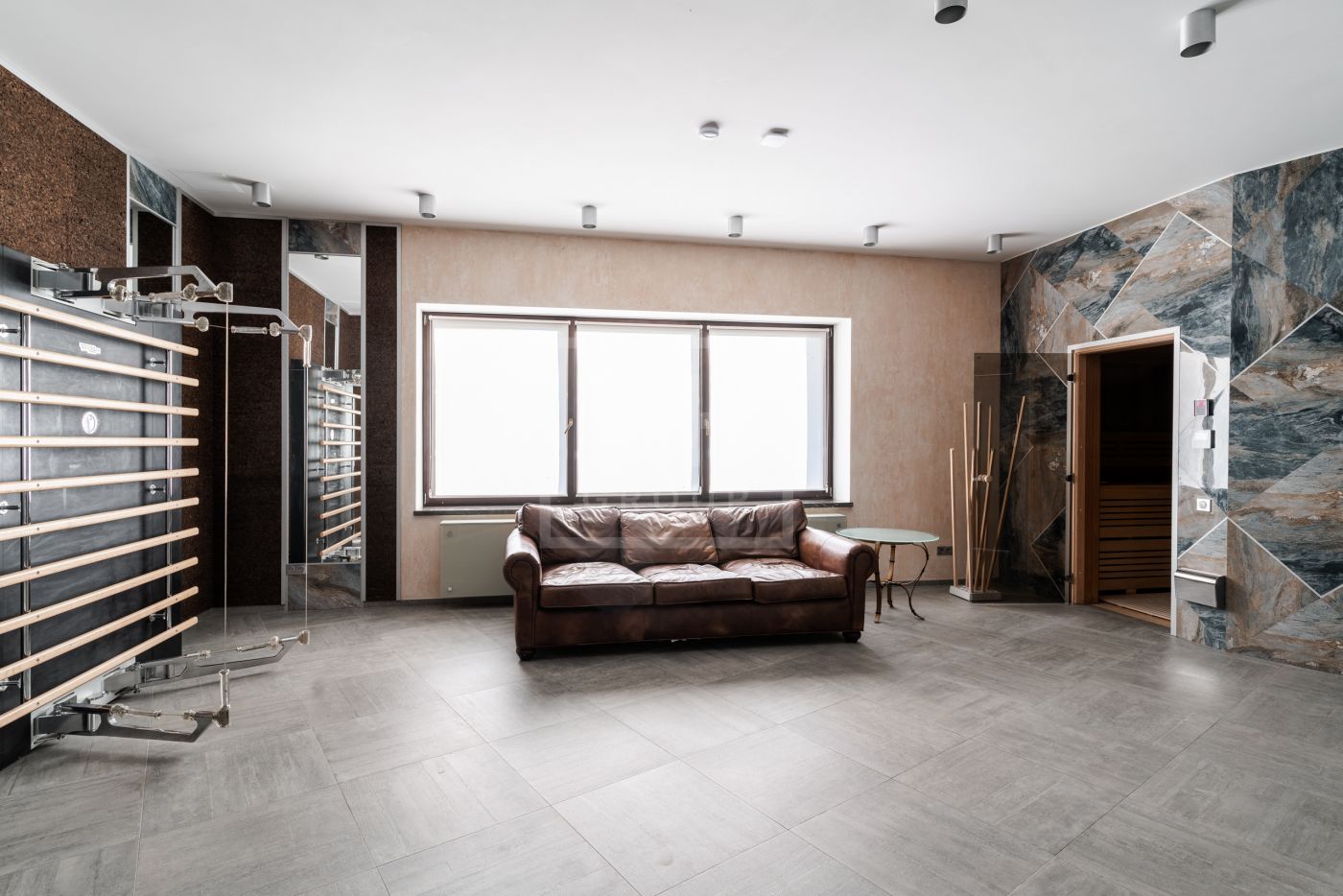 Этаж 1: Холл, гардеробная, бассейн, гостевая спальня, ванная комната, спорт зал с сауной и душевыми, обеденная комната, кухня, гостиная, две террасы.