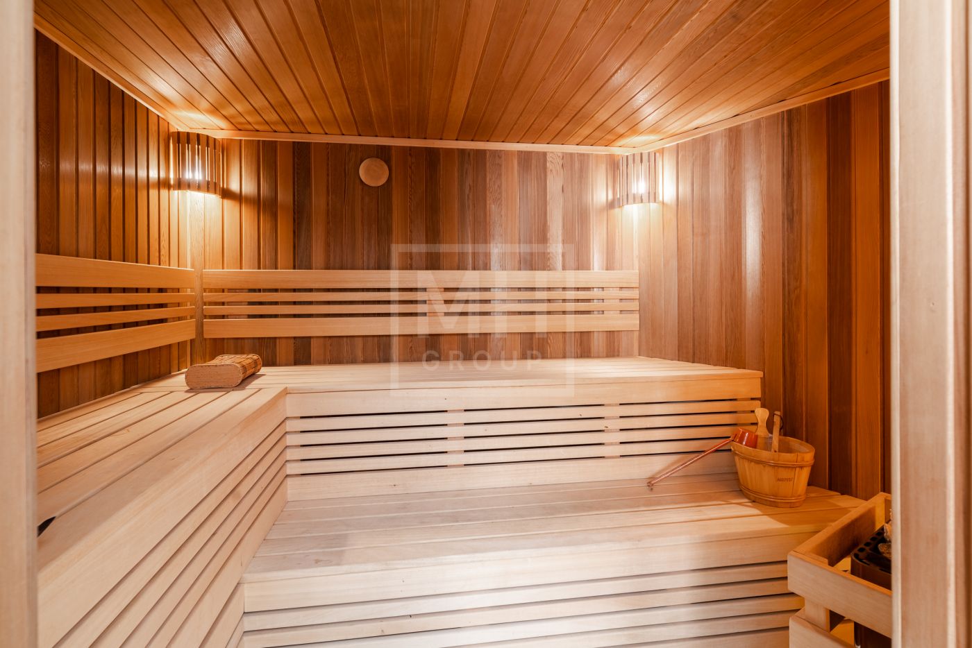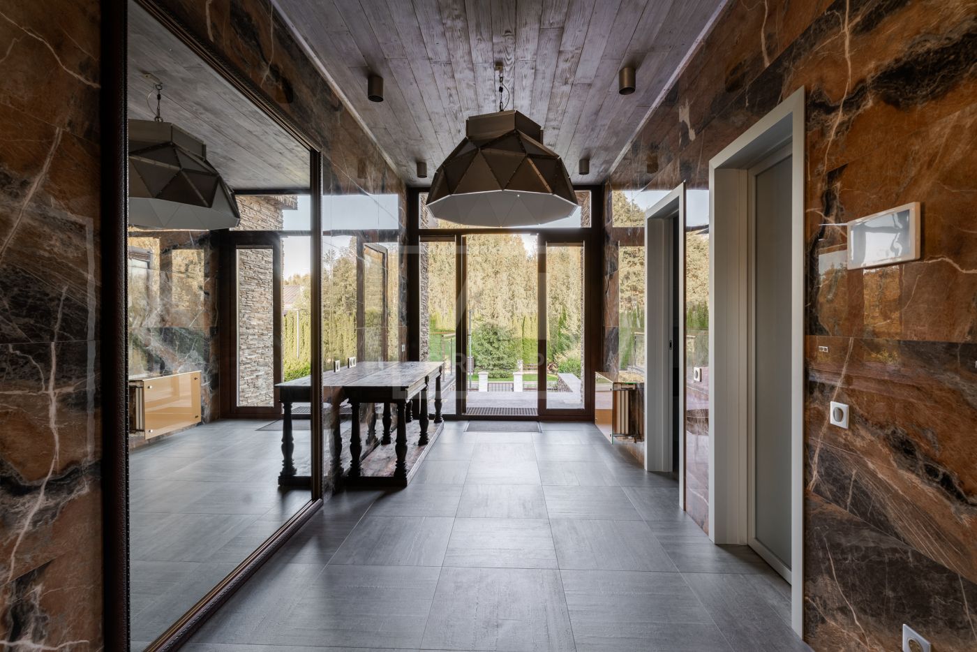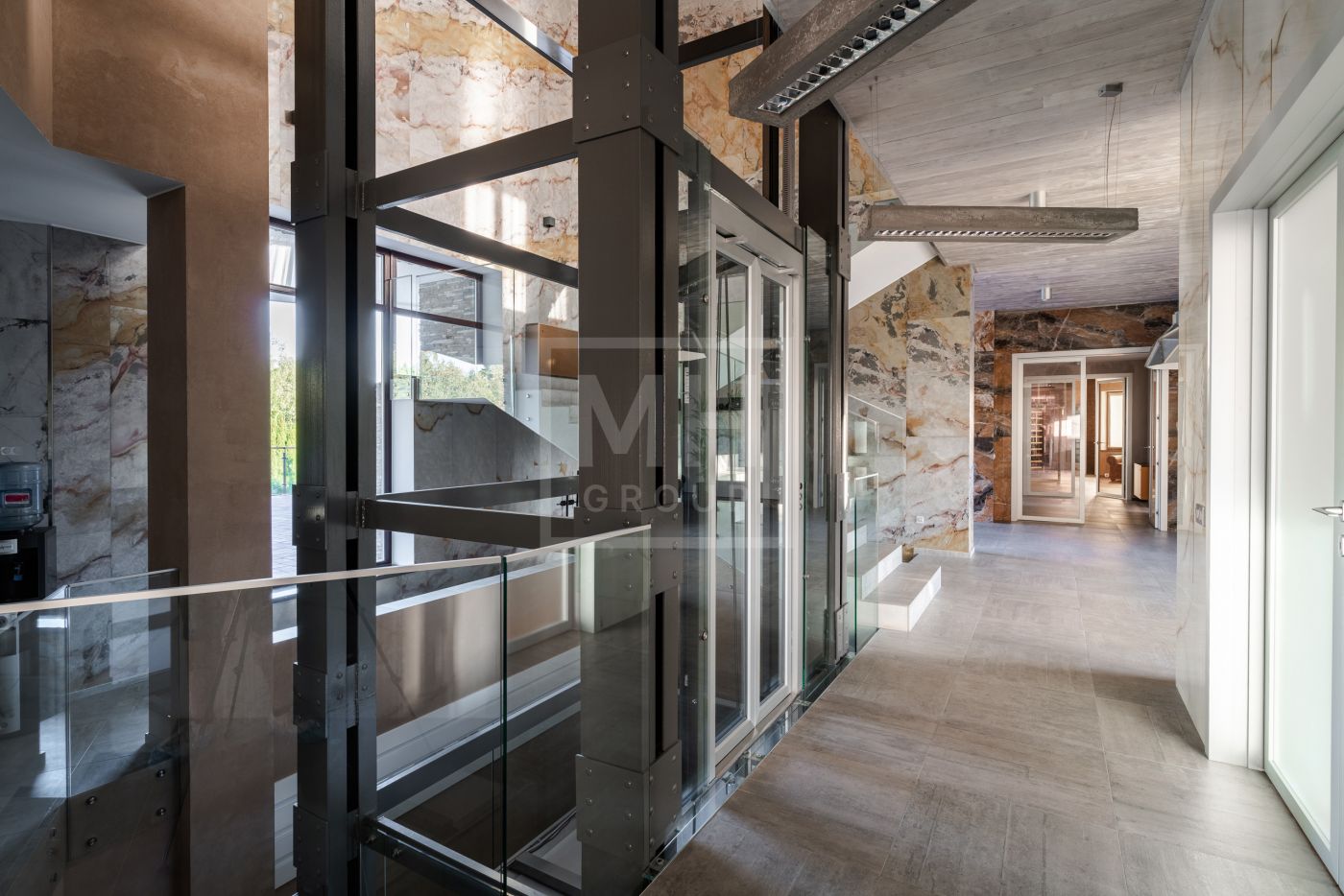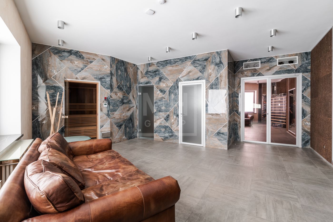Этаж 1: Холл, гардеробная, бассейн, гостевая спальня, ванная комната, спорт зал с сауной и душевыми, обеденная комната, кухня, гостиная, две террасы.