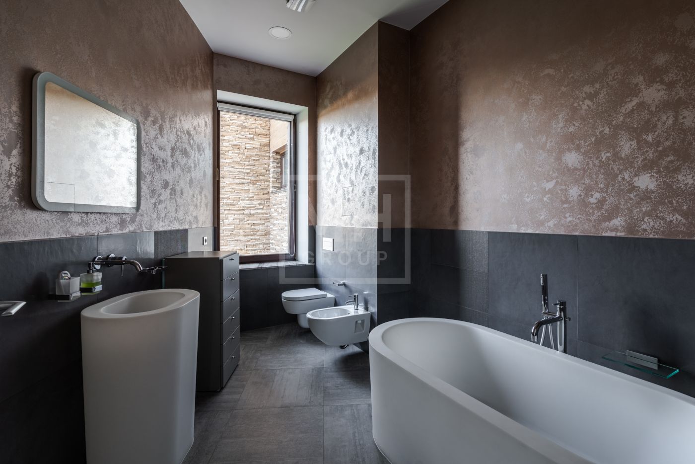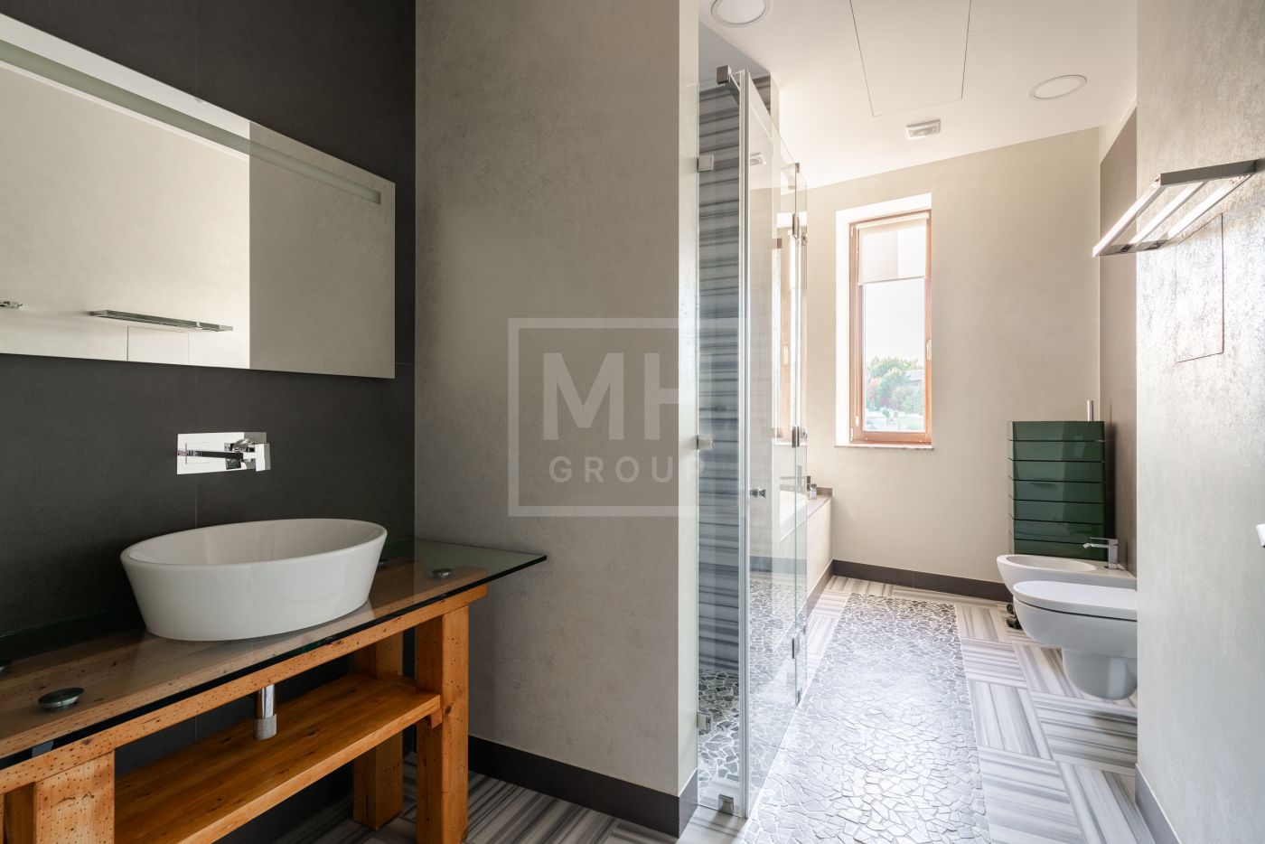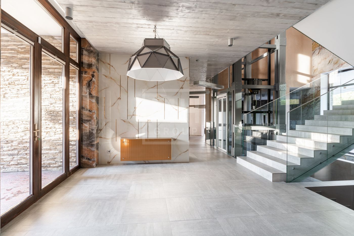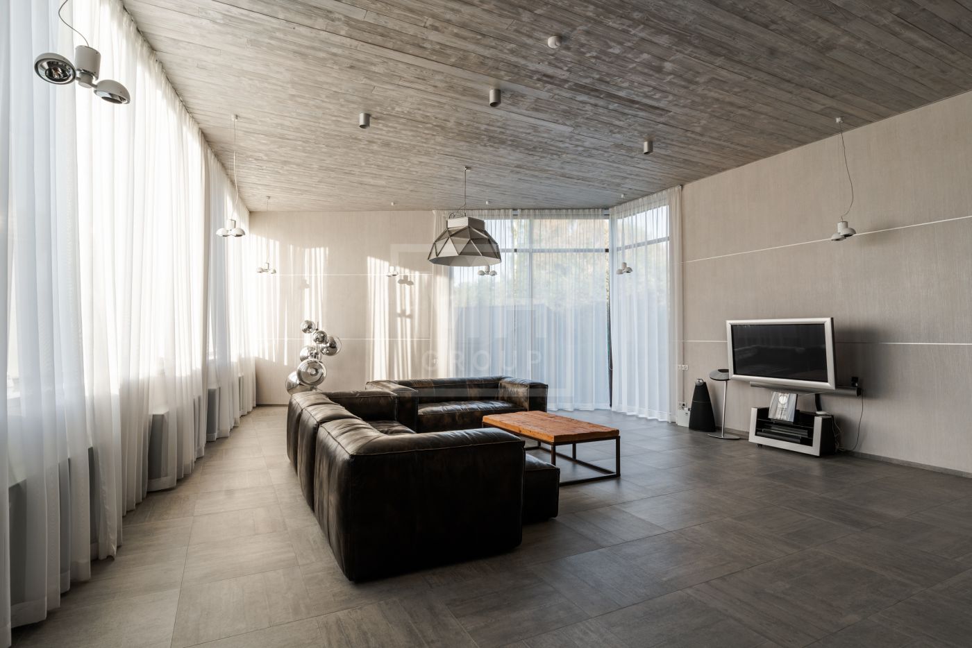Этаж 1: Холл, гардеробная, бассейн, гостевая спальня, ванная комната, спорт зал с сауной и душевыми, обеденная комната, кухня, гостиная, две террасы.