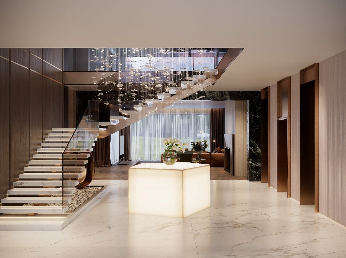 Этаж 1: Прихожая, гардеробная, кухня- столовая-гостиная, с/у, гостевая спальня с с/у, кабинет с с/у, спа-зона с бассейном, сауной, с/у, гараж