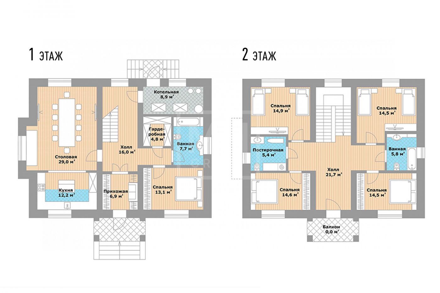 Этаж 1: прихожая, с/у, холл, кухня, столовая, спальня, с/у, гардеробная, котельная.