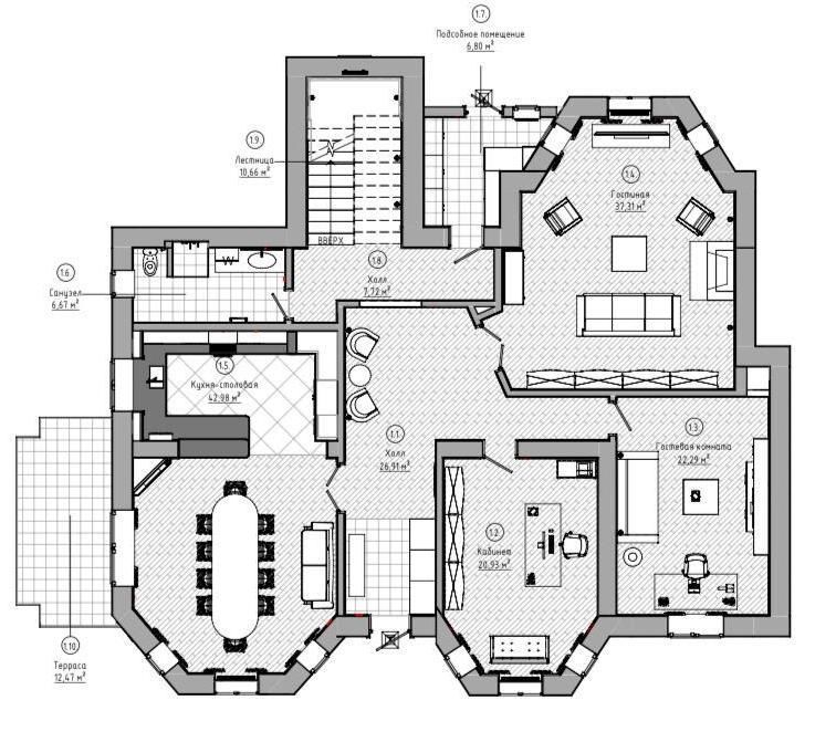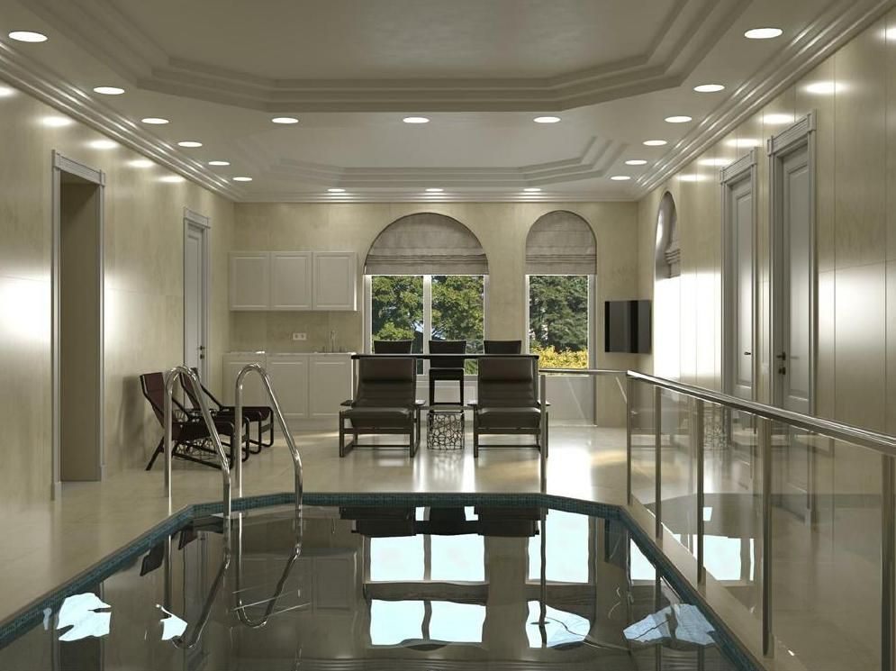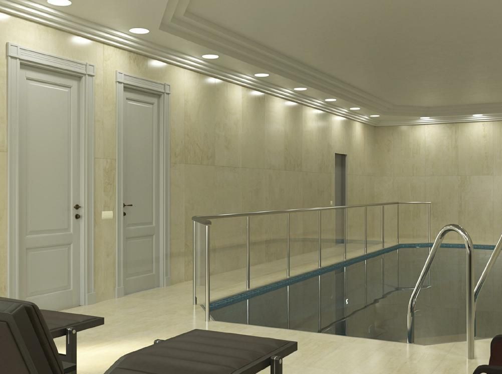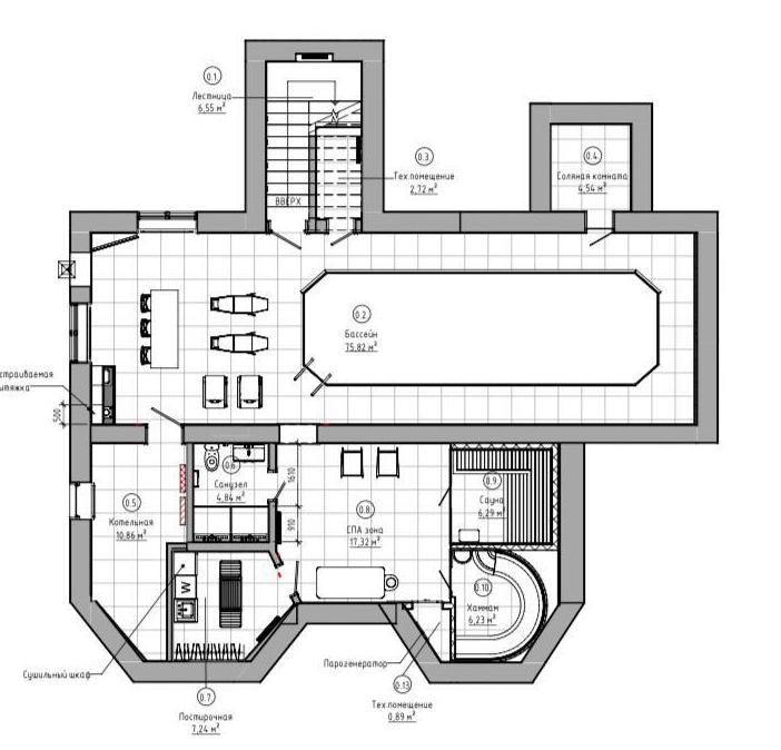 Цоколь: бассейн, соляная комната, сауна, хаммам, массажная, санузел, душевая, выход на террасу, котельная.