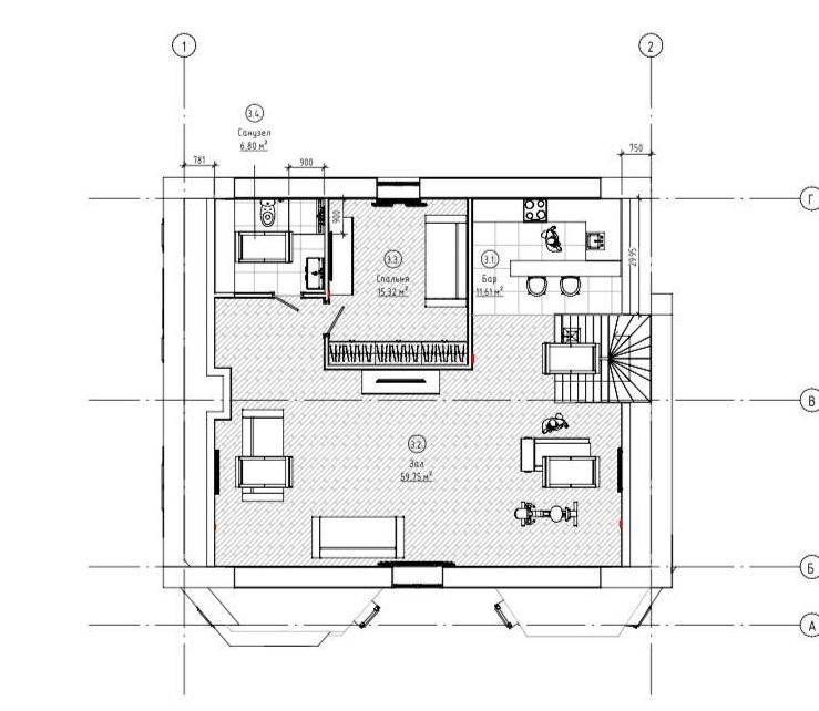 Этаж 1: прихожая, кухня-столовая, гостиная с камином, санузел, спальня, кабинет (или спальня).