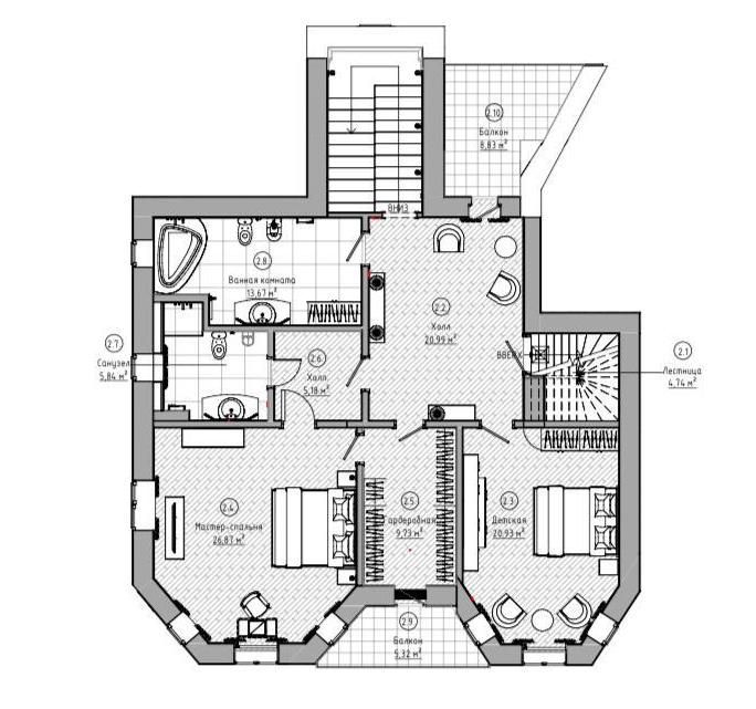 Этаж 2: мастер - спальня с санузлом, гардеробной и балконом, спальня, санузел, балкон.