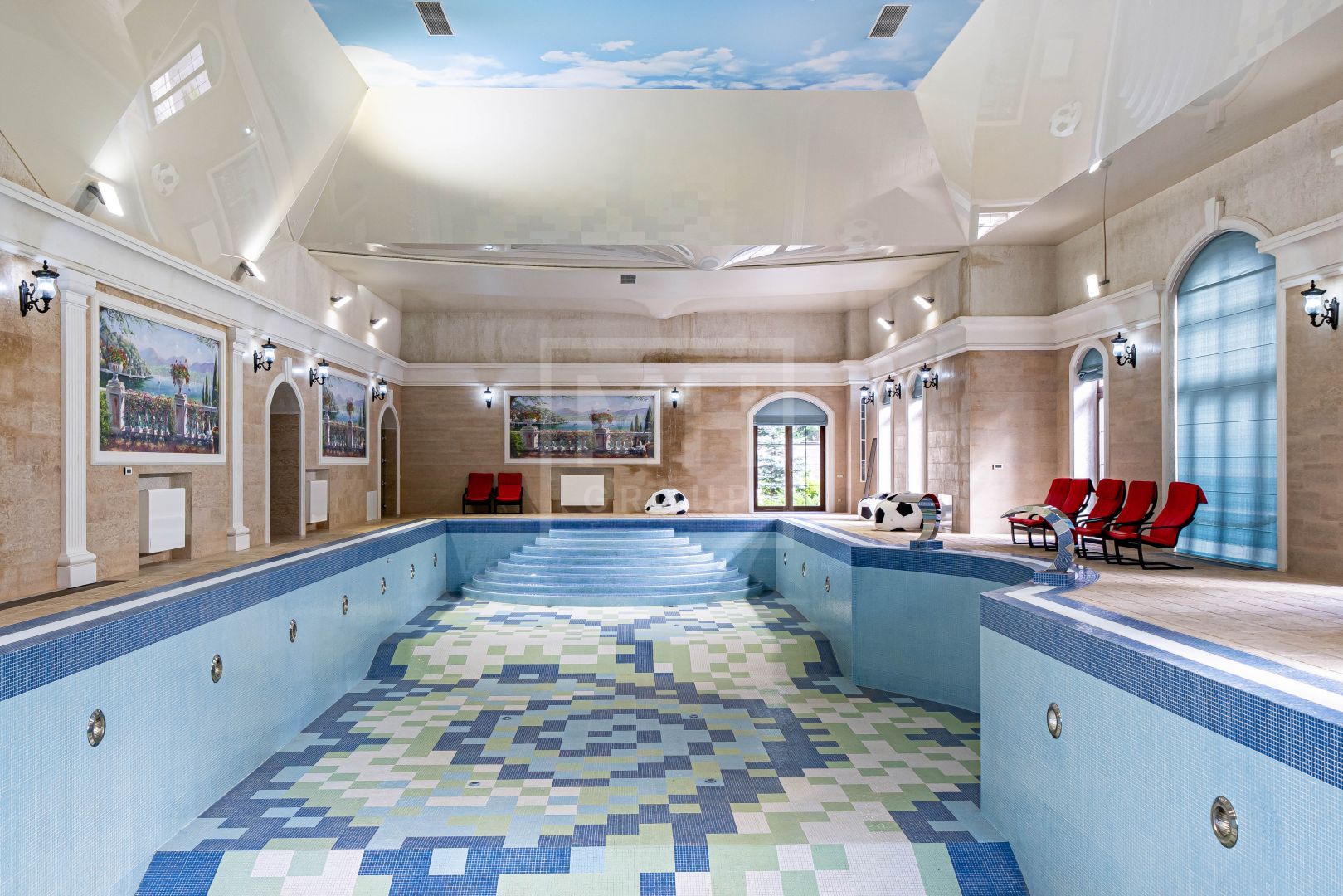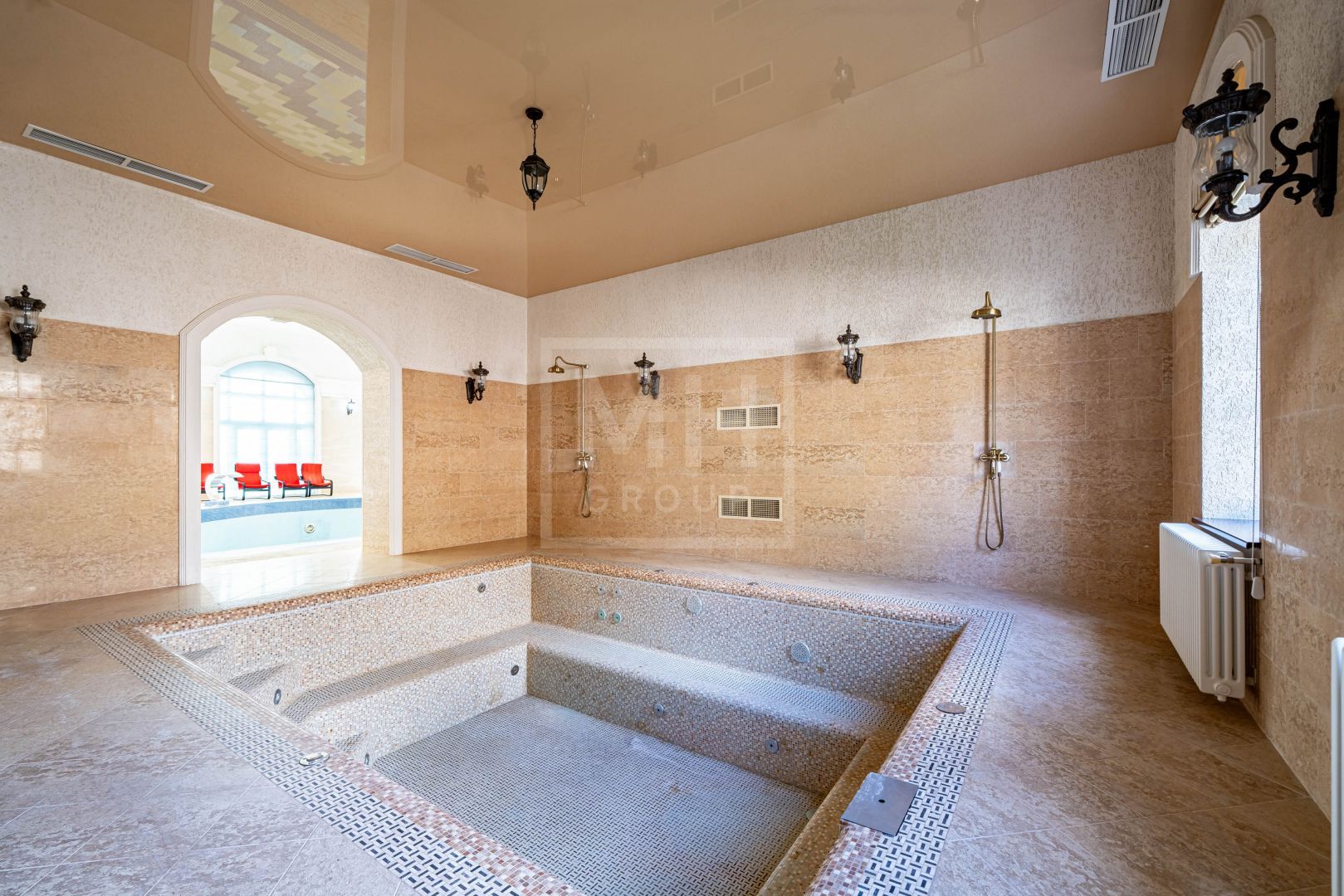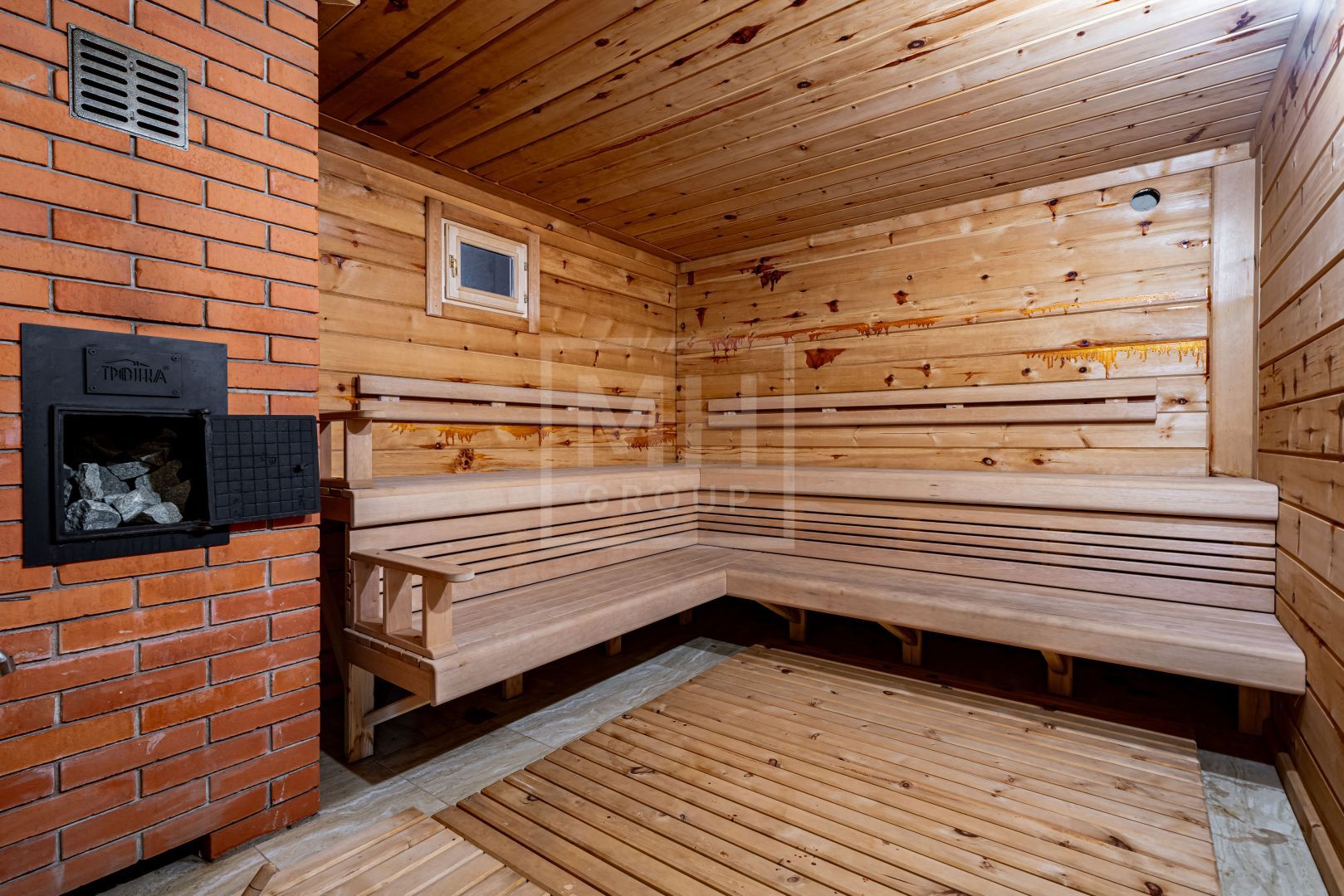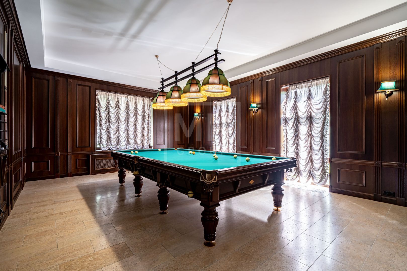 На просторном лесном участке с корабельными соснами располагается дом со SPA- комплексом и бассейном 25 метров.Дом построен из кирпича, в отделке использованы натуральные материалы, такие как травертин, дерево благородных пород, розовый мрамор, стены покрыты венецианской штукатуркой. Кухня оборудована бытовой техникой Bosch, Kuppersbusch, Miele, Liebherr.