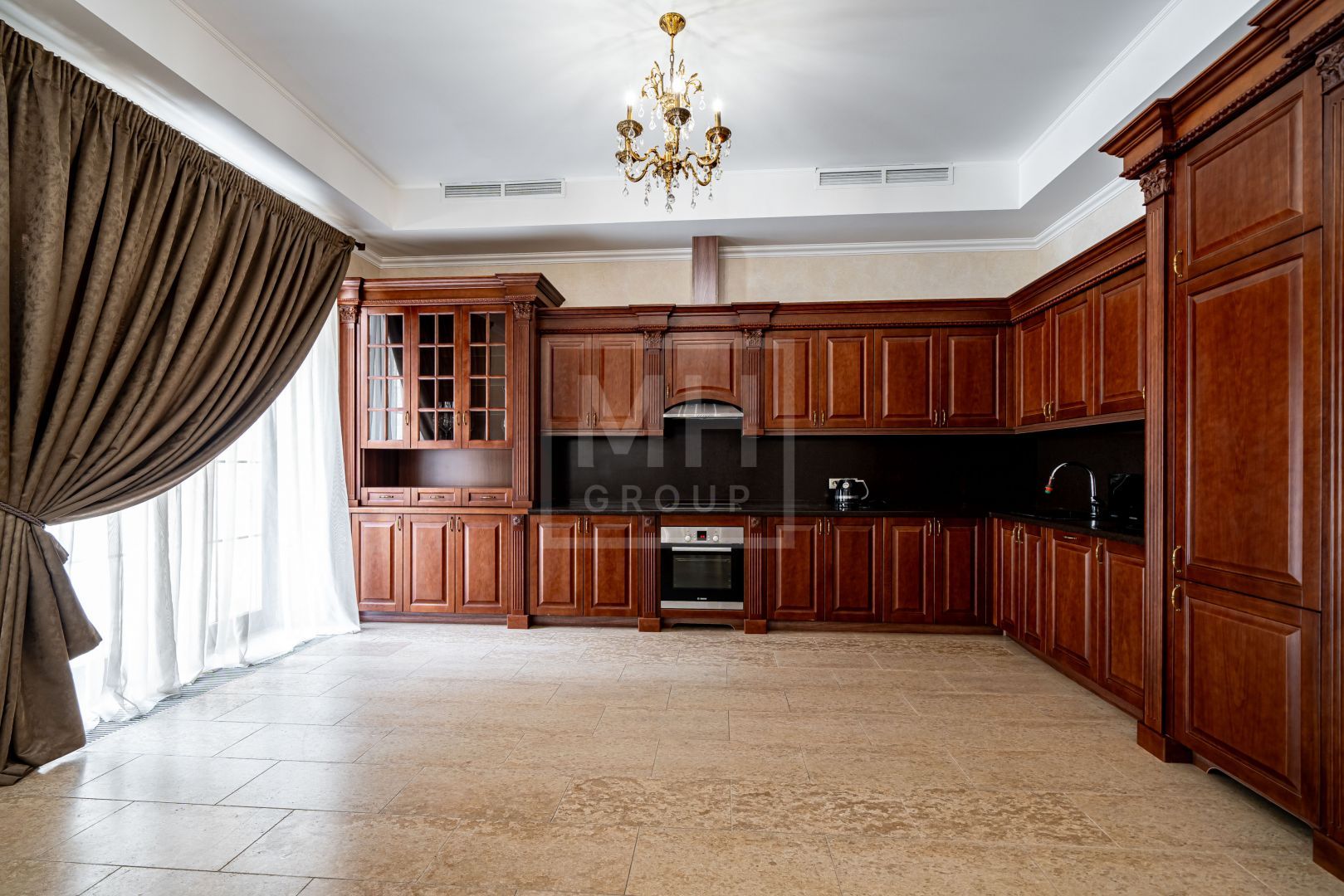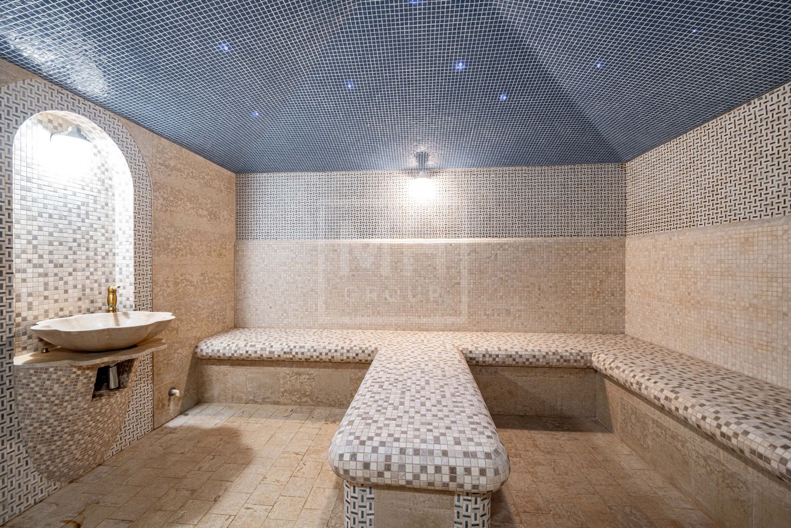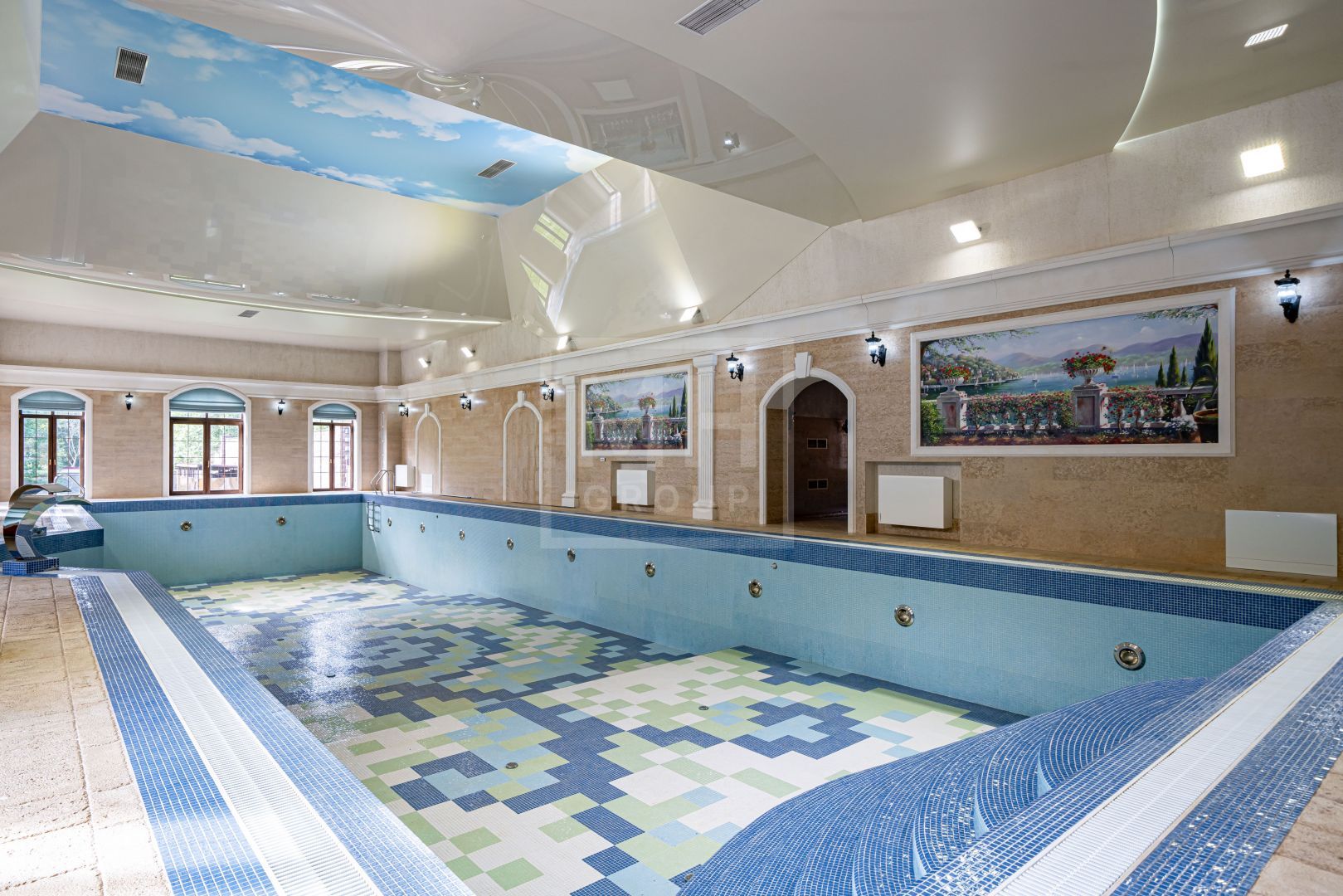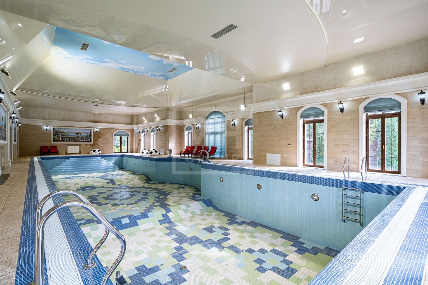 На просторном лесном участке с корабельными соснами располагается дом со SPA- комплексом и бассейном 25 метров.Дом построен из кирпича, в отделке использованы натуральные материалы, такие как травертин, дерево благородных пород, розовый мрамор, стены покрыты венецианской штукатуркой. Кухня оборудована бытовой техникой Bosch, Kuppersbusch, Miele, Liebherr.