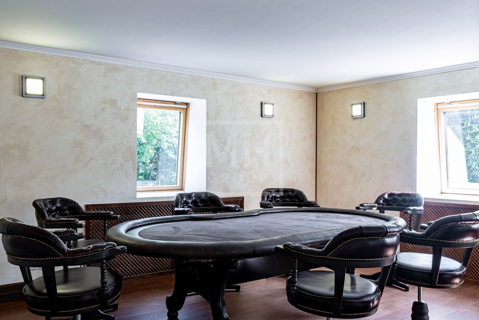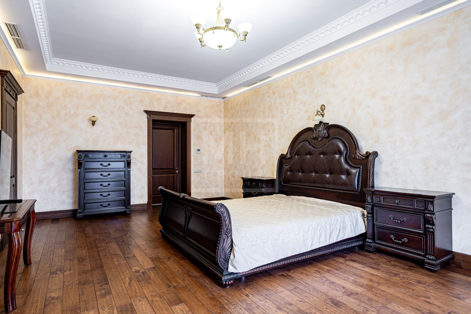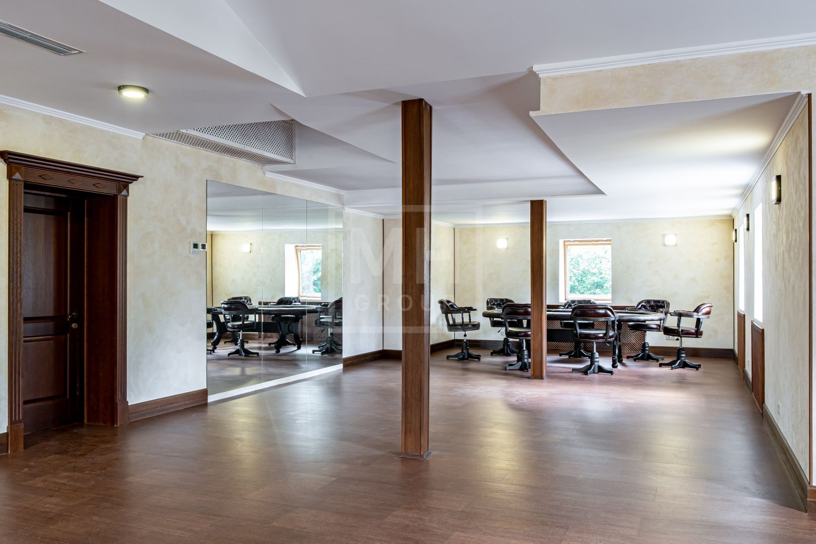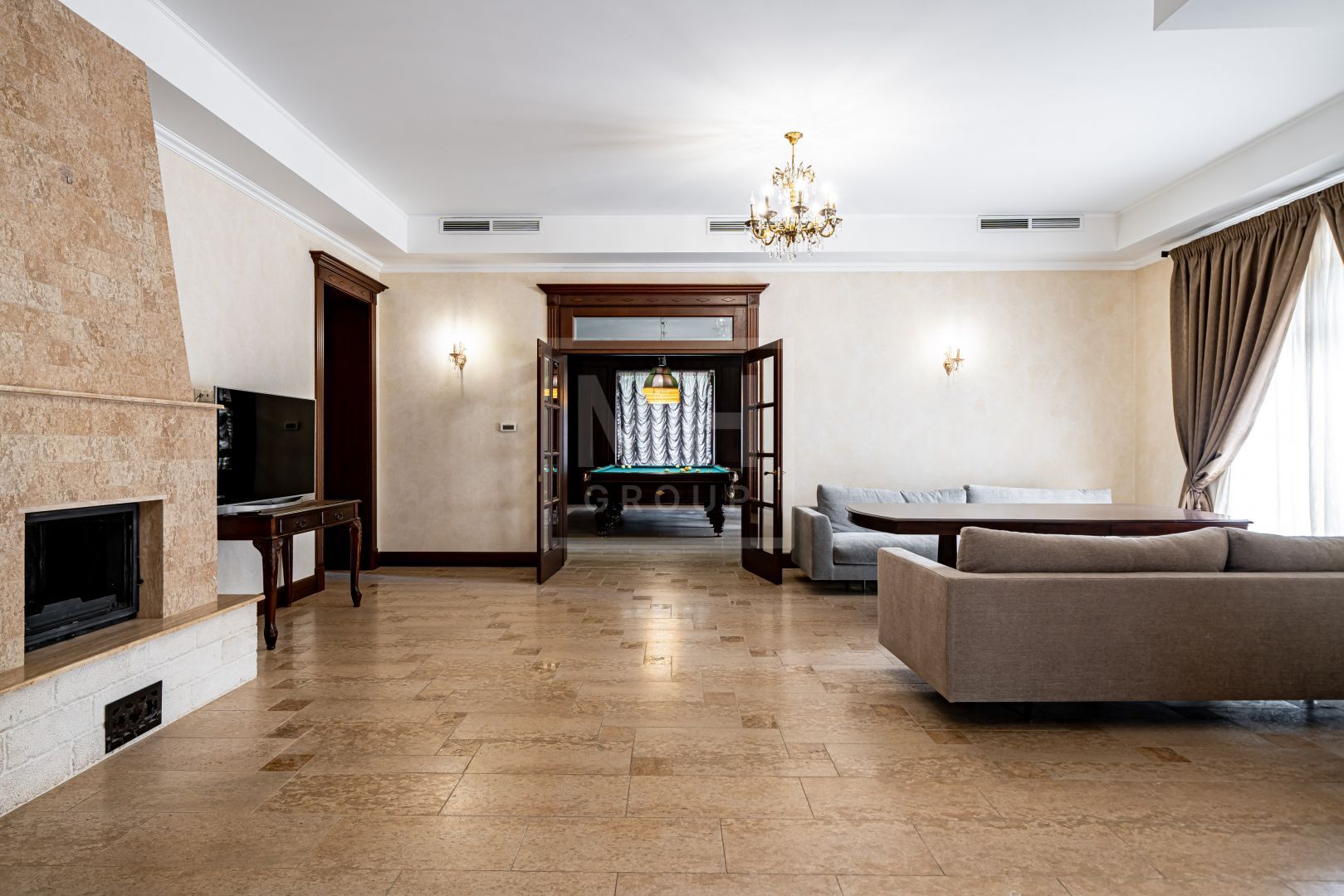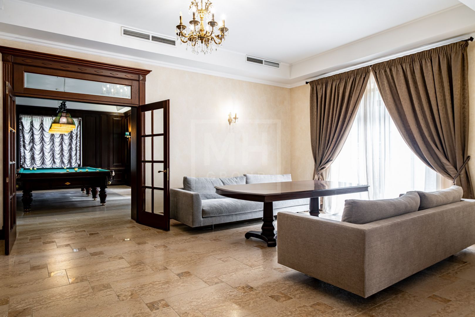 На просторном лесном участке с корабельными соснами располагается дом со SPA- комплексом и бассейном 25 метров.Дом построен из кирпича, в отделке использованы натуральные материалы, такие как травертин, дерево благородных пород, розовый мрамор, стены покрыты венецианской штукатуркой. Кухня оборудована бытовой техникой Bosch, Kuppersbusch, Miele, Liebherr.