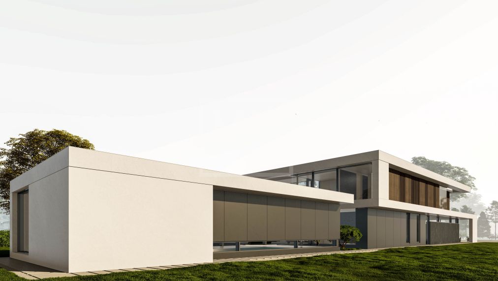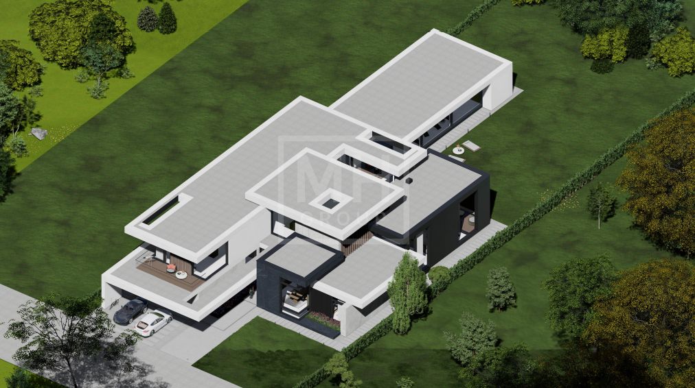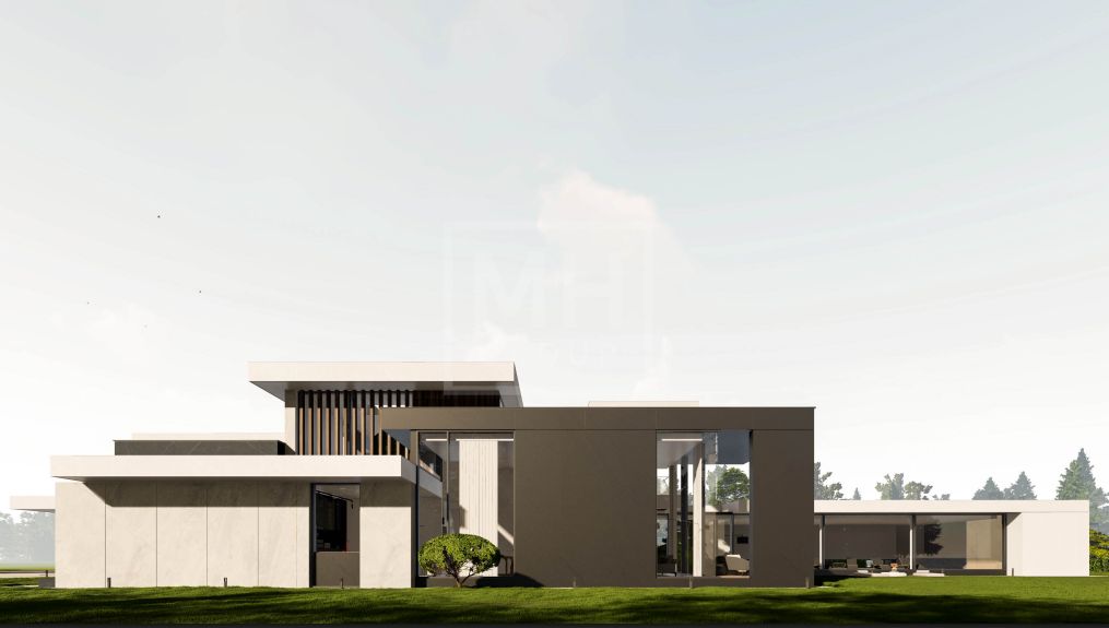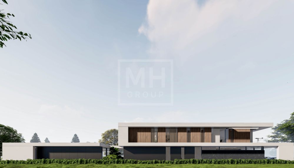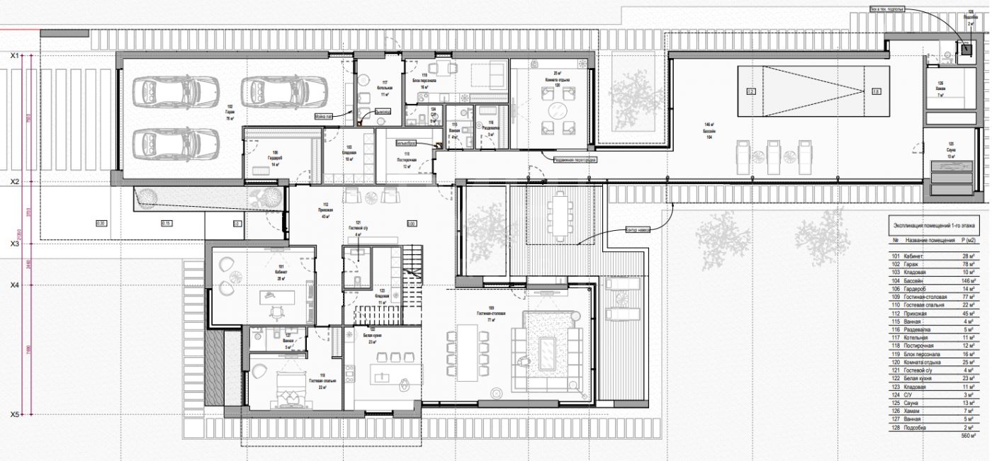 Этаж 1: прихожая, холл, гардеробная, гостевой с/у, просторная зона гостиной- столовой и кухни с панорамным остеклением и выходом на террасу и участок, СПА-зона (бассейн, комната отдыха, сауна, хаммам, санузел, душевая, раздевалка), кабинет, спальня первого этажа с санузлом, кладовая, черновая кухня, постирочная, блок для персонала (спальня, санузел, кухня), отапливаемый гараж на три автомобиля, котельная.