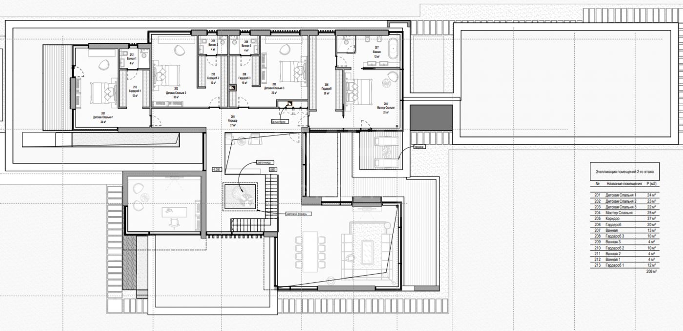Этаж 2: Мастер спальня с санузлом и гардеробной, три детские спальни с санузлами и гардеробными.
