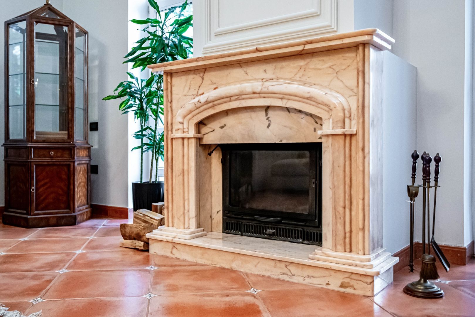 На первом этаже расположен просторный холл с высокими потолками, гостиная с камином, кухня-столовая, отдельный кабинет и санузел. Отделка выполнена с использованием натуральных материалов, таких как дерево, камень, мягкие пастельные оттенки стен создают ощущение тепла и уюта.