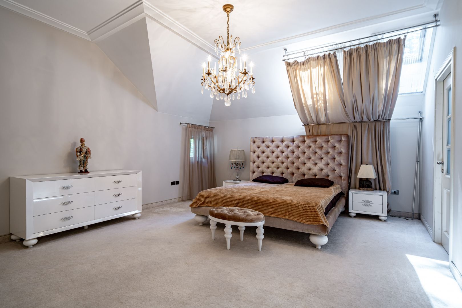 На втором этаже находятся три светлые спальни с санузлами и гардеробными и зоной отдыха в мастер блоке, площадь мастер блока 120 м2, что позволит оборудовать дополнительную большую гардеробную или еще одну спальню. Во всех комнатах большие окна, через которые в дом проникает естественное освещение и открывается живописный вид на участок.