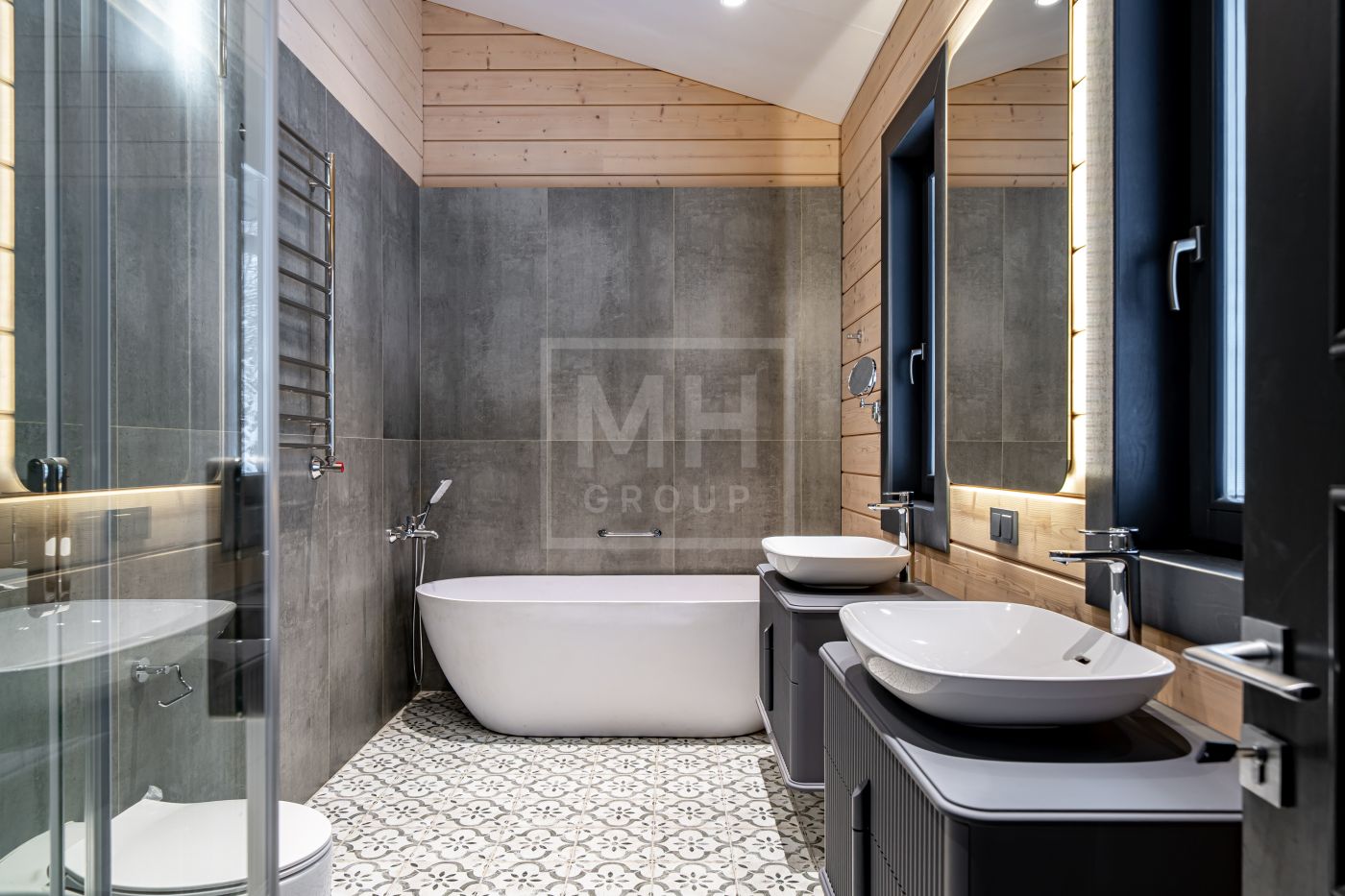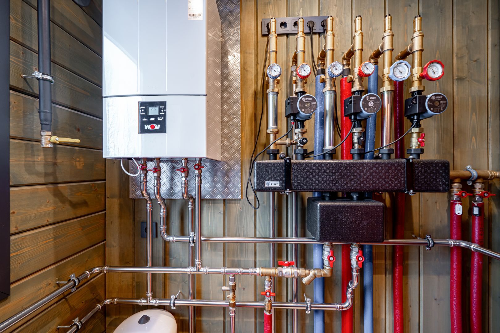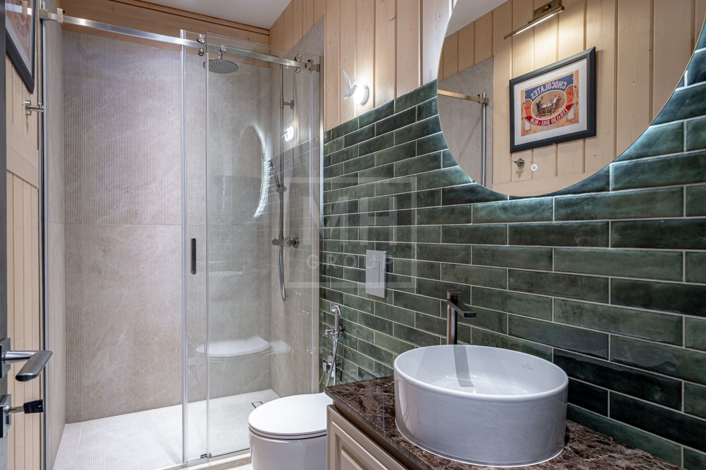 Газовый котёл WOLF (Германия) с резервным электрокотлом,сантехника Villeroy & Boch, смесители Gessi (Италия), Hahsgrohe. Заказные душевые кабины из стекла 8 мм. с фурнитурой (Австрия),