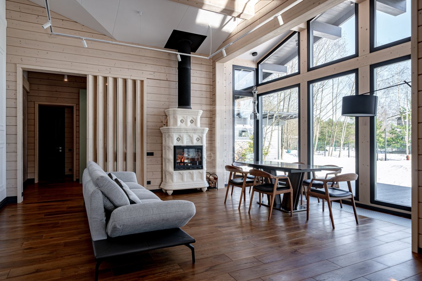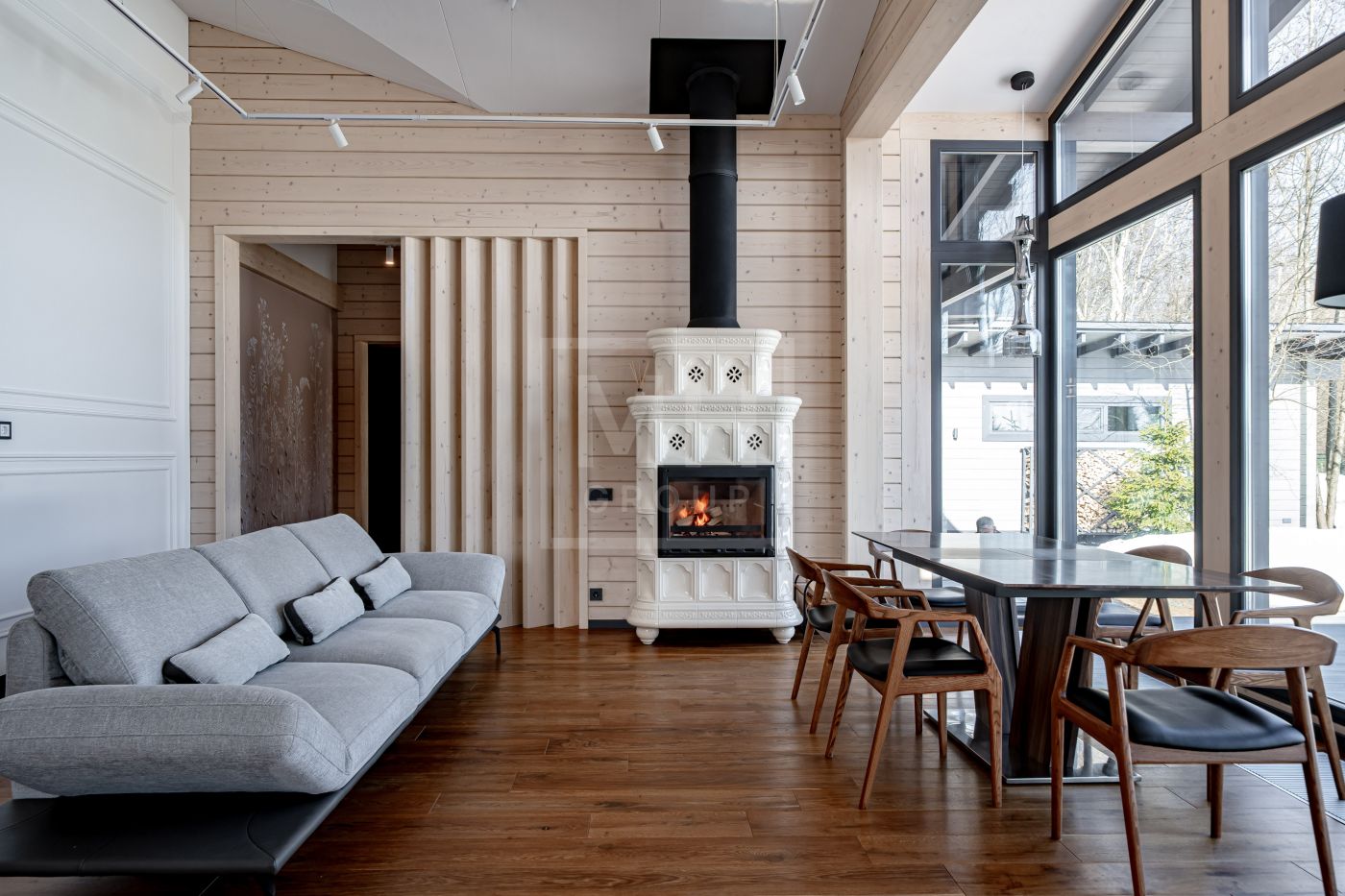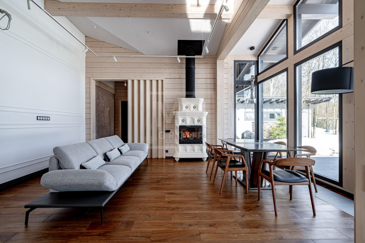 В доме несколько сценариев освещения от культового итальянского дизайнерского бренда FLOS -естественный мягкий свет подчеркивает все достоинства материалов, включая их высокое качество, а также элегантно акцентирует внимание на сочетаниях фактур. Изразцовый камин ванильного цвета создаёт в гостиной уют и дарит ощущение тепла.