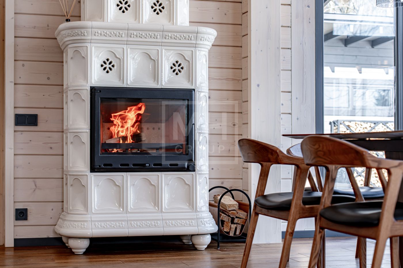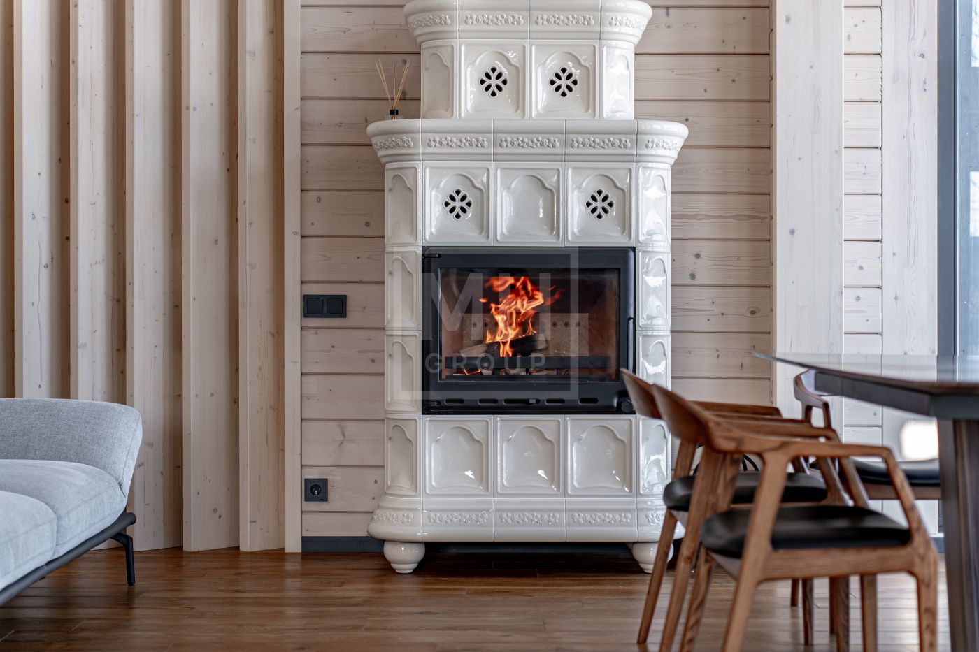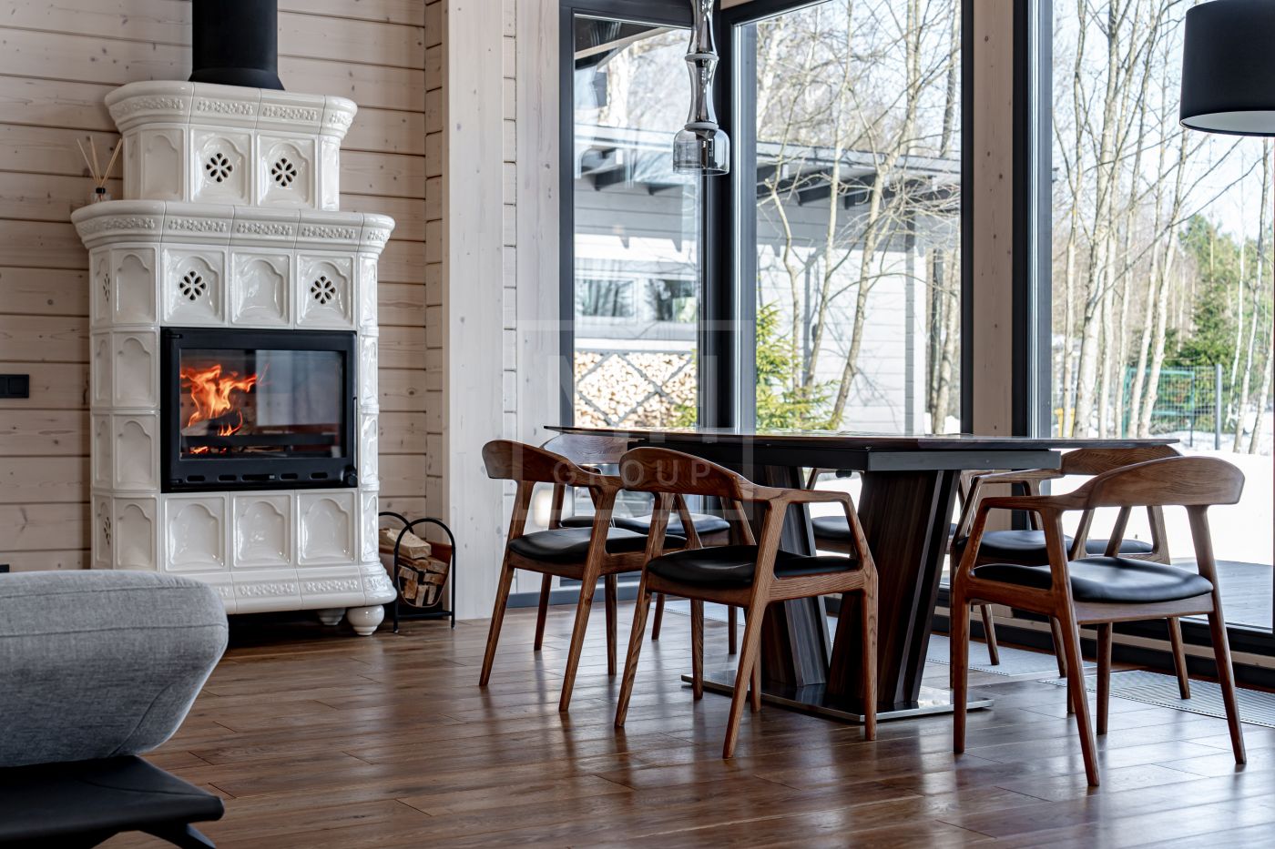 В доме несколько сценариев освещения от культового итальянского дизайнерского бренда FLOS -естественный мягкий свет подчеркивает все достоинства материалов, включая их высокое качество, а также элегантно акцентирует внимание на сочетаниях фактур. Изразцовый камин ванильного цвета создаёт в гостиной уют и дарит ощущение тепла.