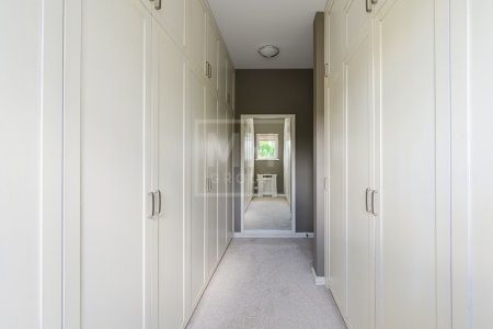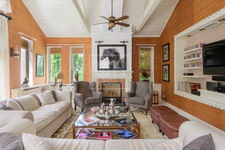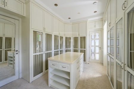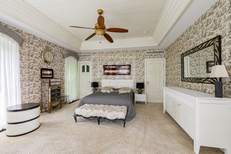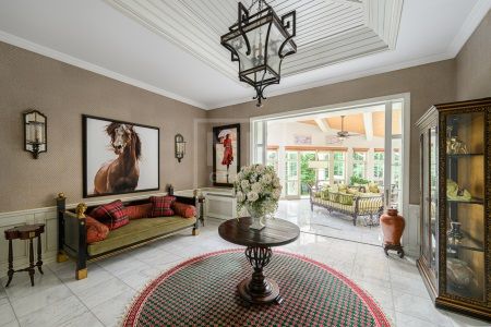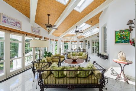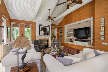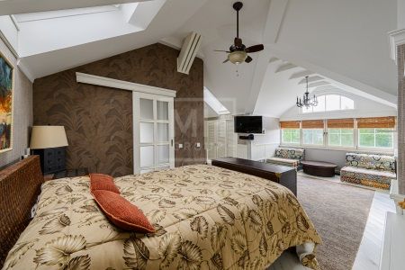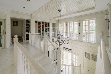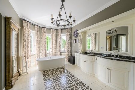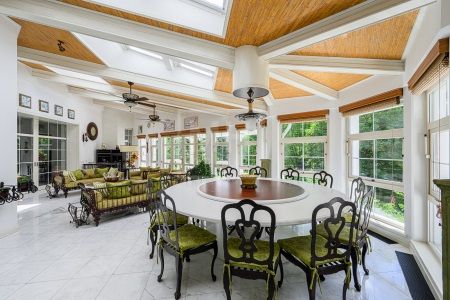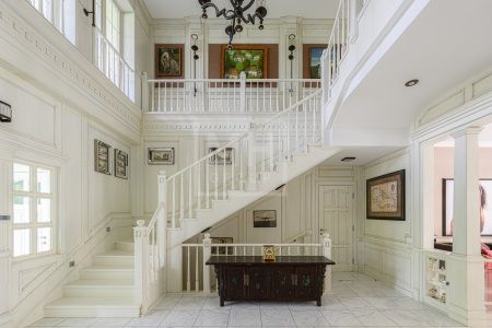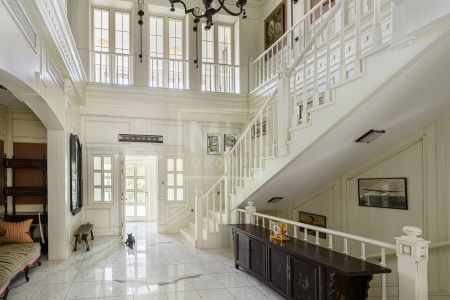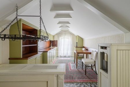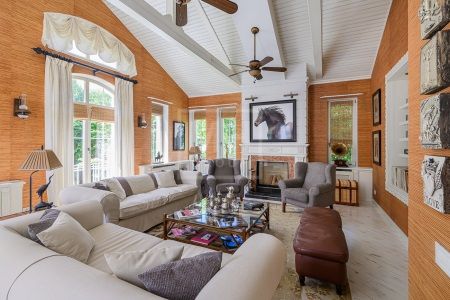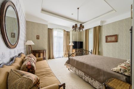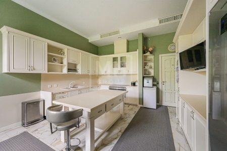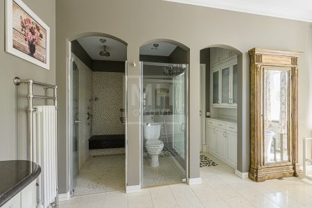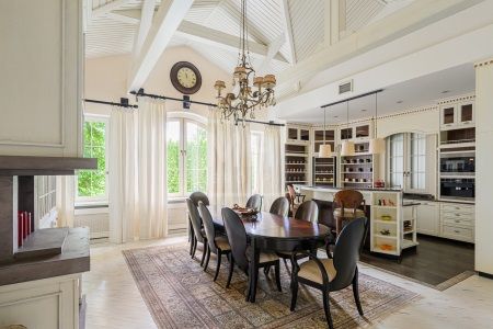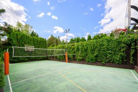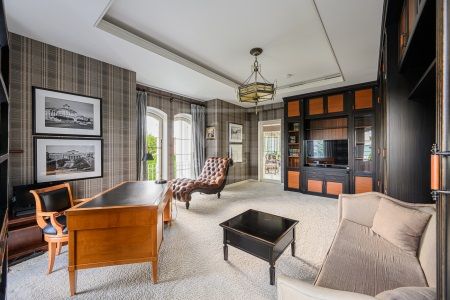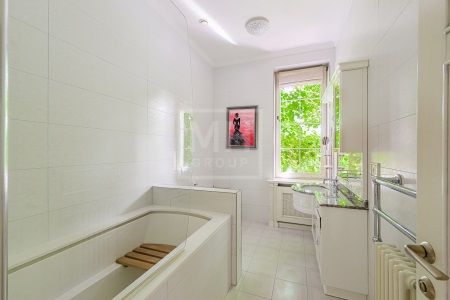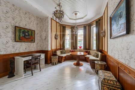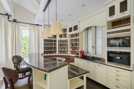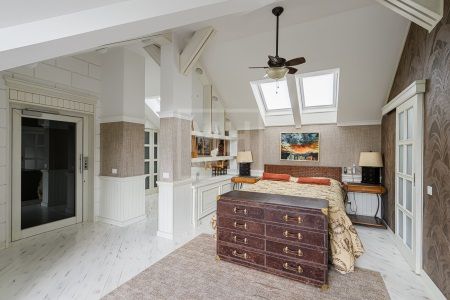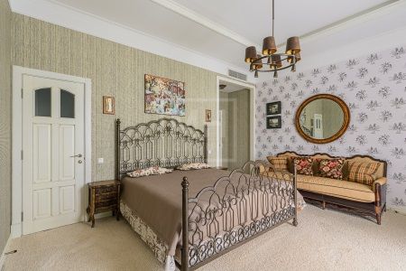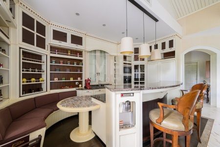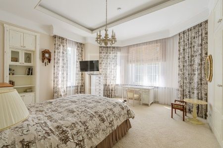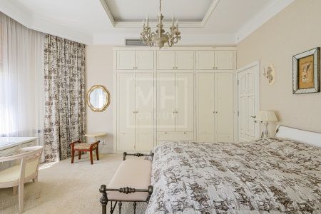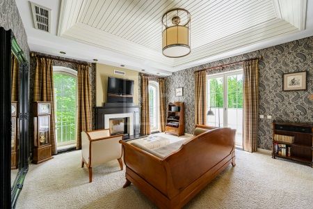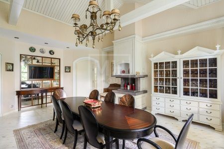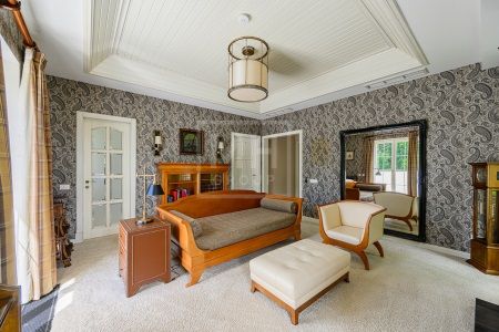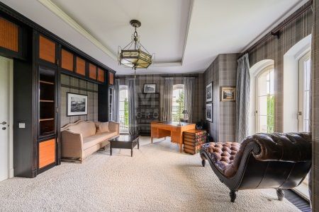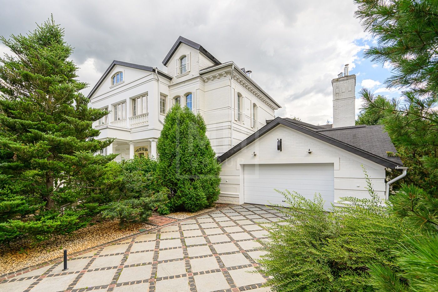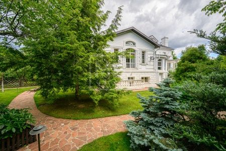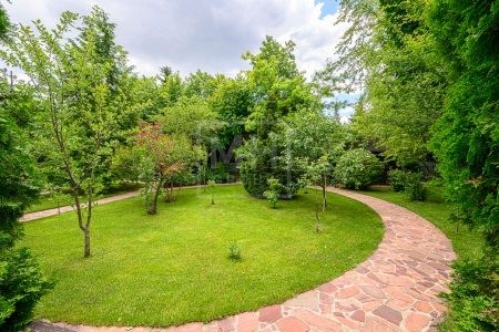 Особого внимания заслуживает парковый ландшафт, окружающий особняк. Ухоженный сад с многолетними деревьями и цветущими кустарниками создает идиллическую атмосферу и обеспечивает полную приватность. На территории участка также находится отдельный дом для персонала и охраны с встроенным гаражом площадью 128,4 м, что обеспечивает дополнительное удобство и практичность.