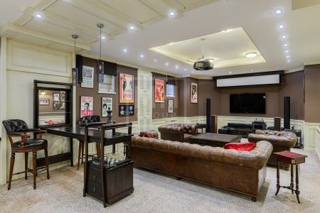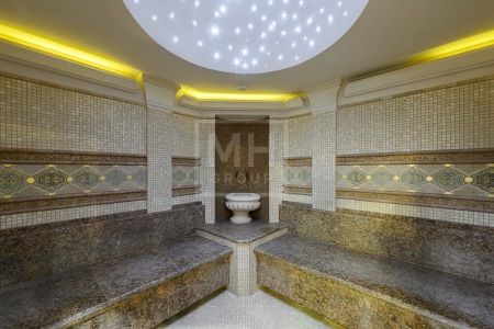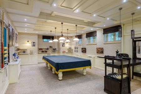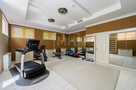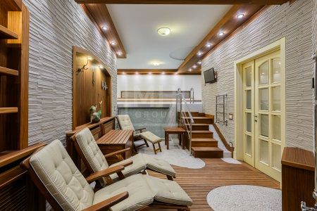 Цоколь: большая гардеробная, бильярдная, домашний кинотеатр, с/у, СПА-зона с хаммамом, бассейн, постирочная, холодильная комната, котельная, с/у, гардеробная, комната для персонала, гардеробная, спортзал с выходом на участок.