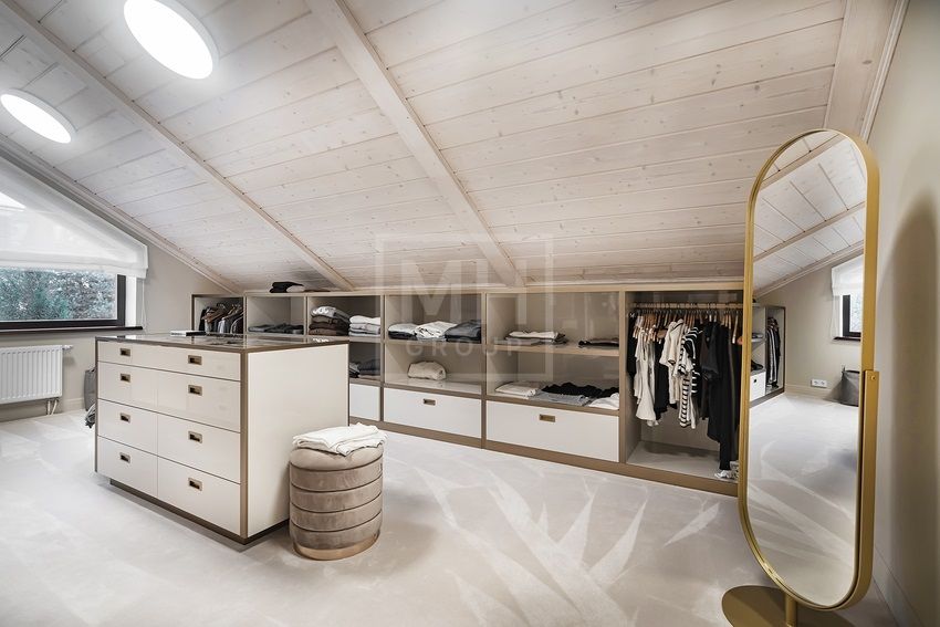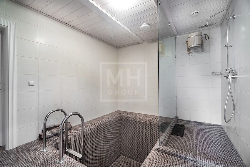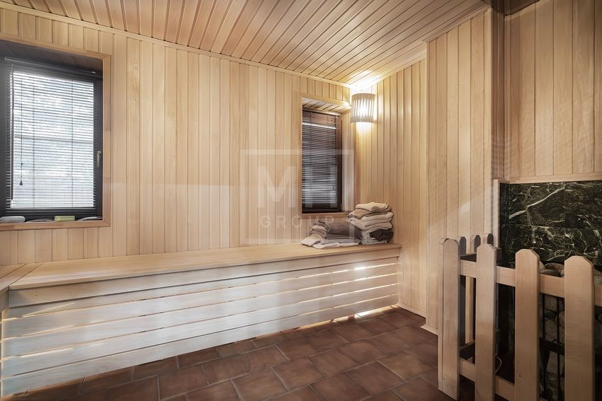 Этаж 1: холл, гардеробная, гостевой санузел, кабинет с санузлом / гостевая спальня, гостиная с камином, кухня-столовая с выходом на террасу с зоной барбекю, СПА (сауна, купель, душевая, санузел, комната отдыха), постирочная, кладовая, гараж на 2 м/м с мойкой для машин;
