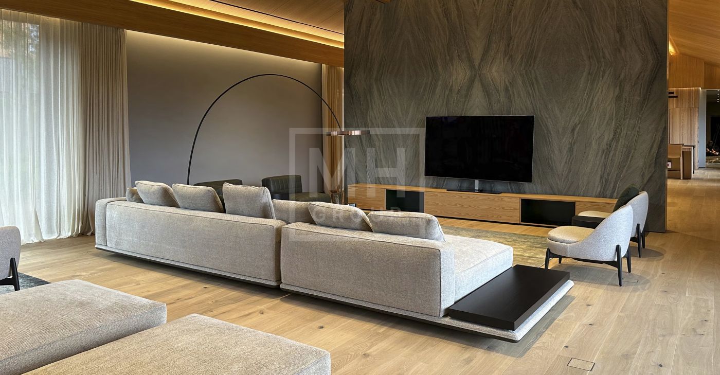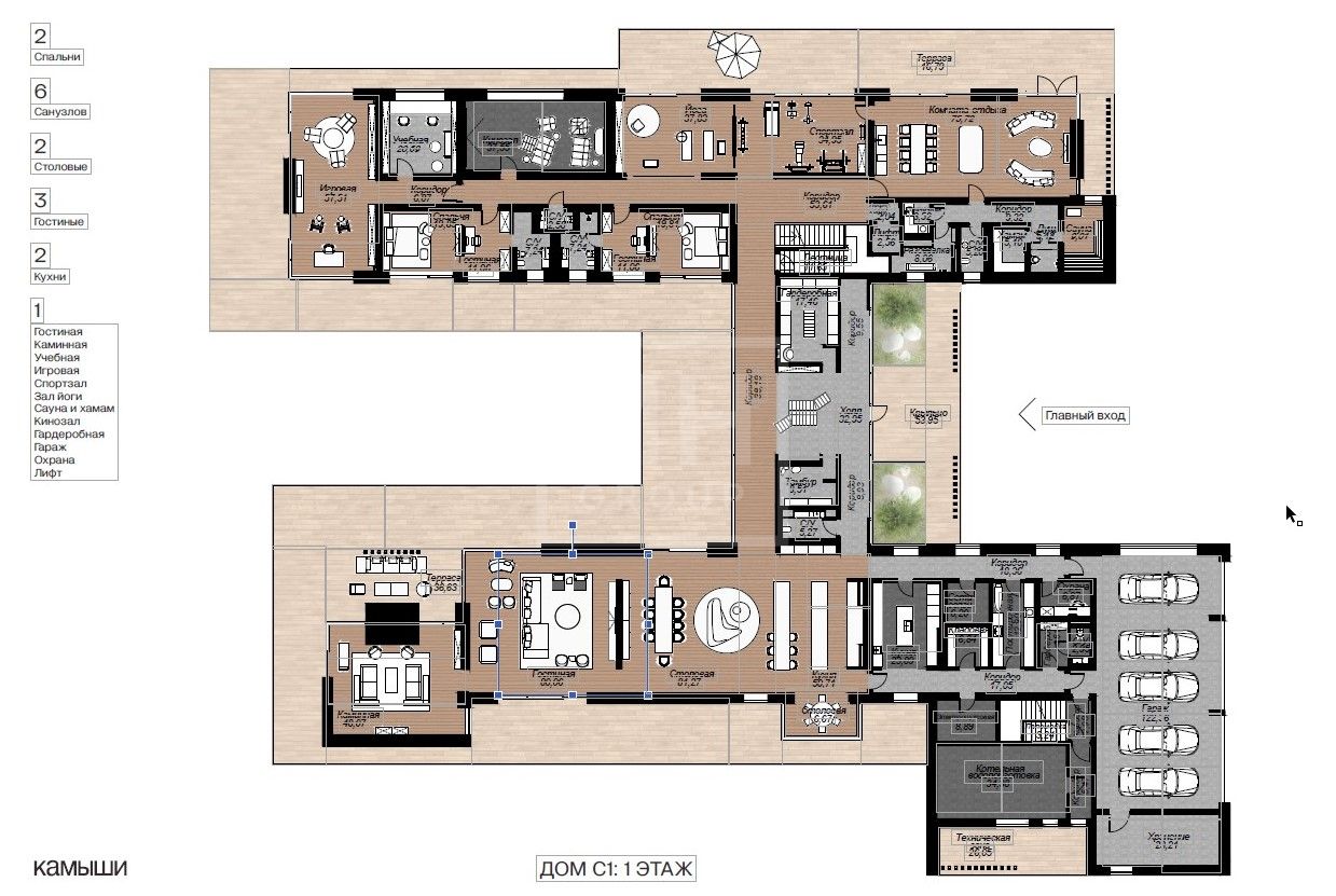 Этаж 1: Гостиная , 2 столовые 2 спальни, 6 с/у, 3 гостиные, 2 кухни,, каминная, учебная, спортзал, зал йоги, сауна и хамам, кинозал, гардеробная, гараж, охрана, лифт