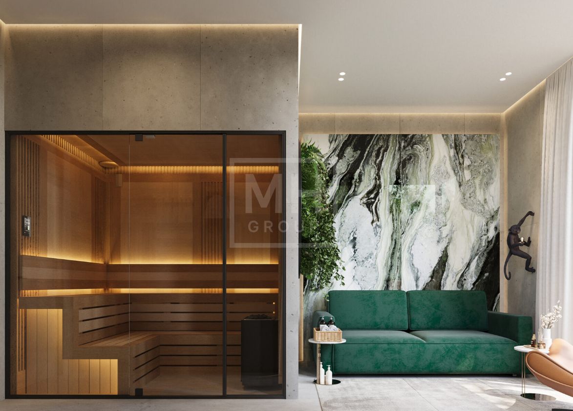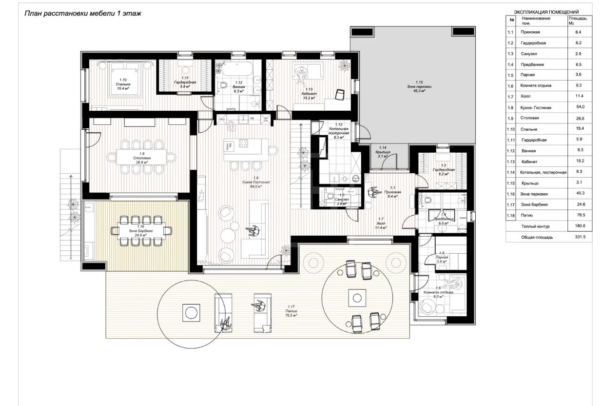 Этаж 1: Прихожая, гардеробная, с/у, кухня-столовая-гостиная с камином и вторым светом, спальня с с/у и гардеробной, кабинет, СПА-блок с сауной и комнатой отдыха, котельная с постирочной, терраса с зоной барбекю