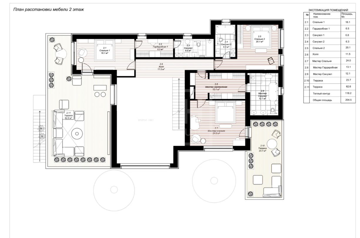 Этаж 2: Мастер-спальня с с/у и гардеробной, спальня с с/у и гардеробной, спальня с с/у
