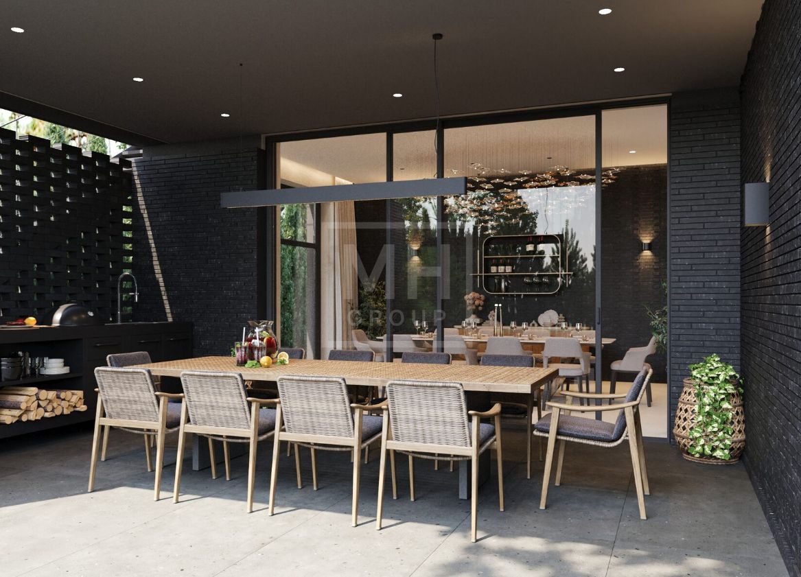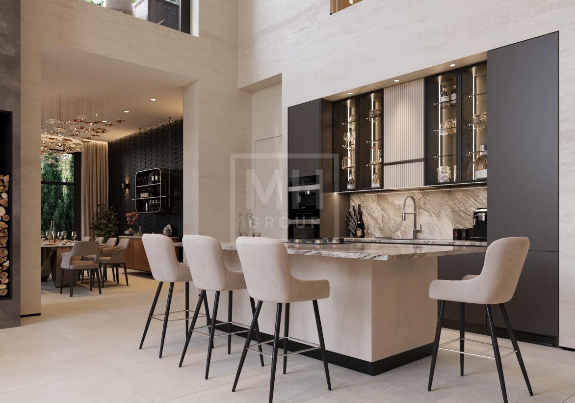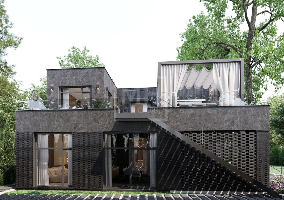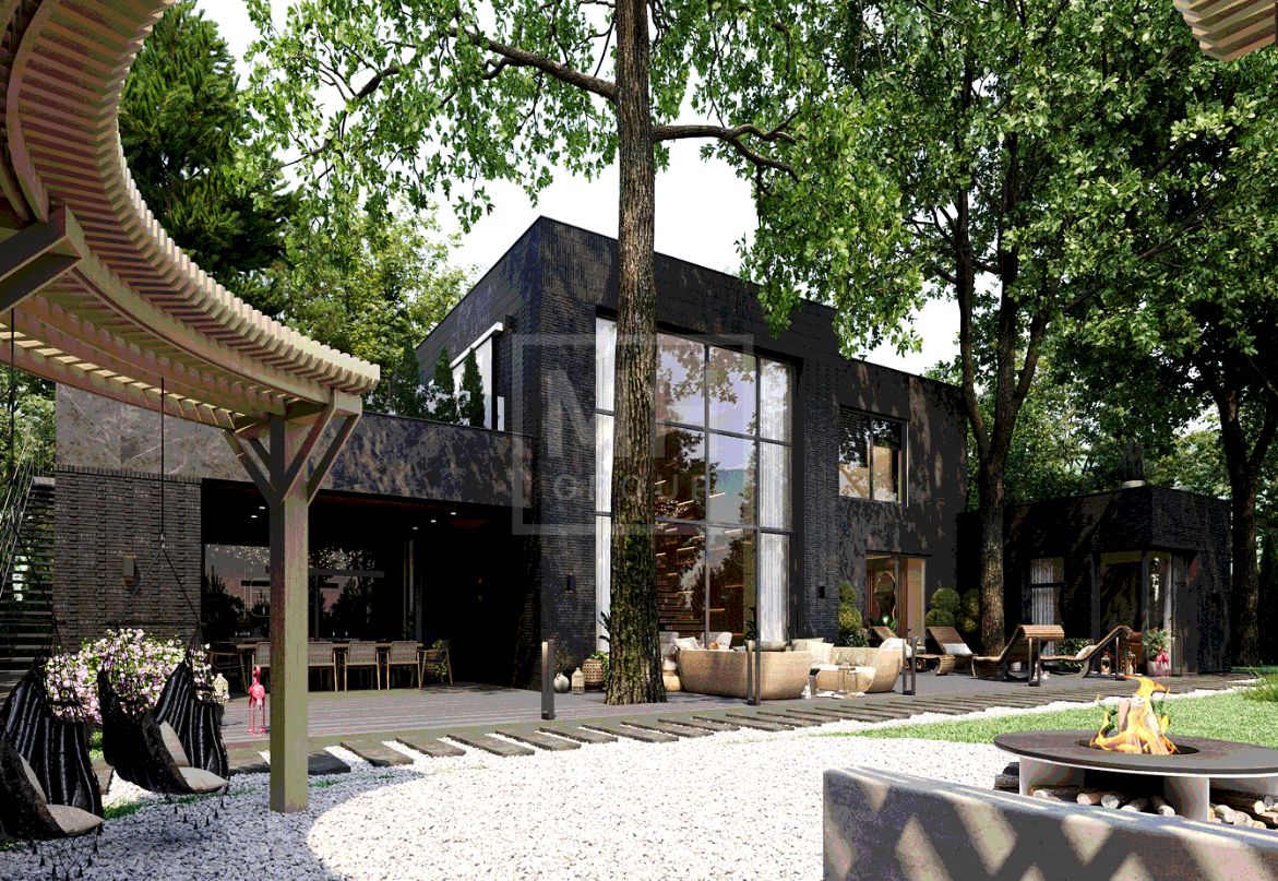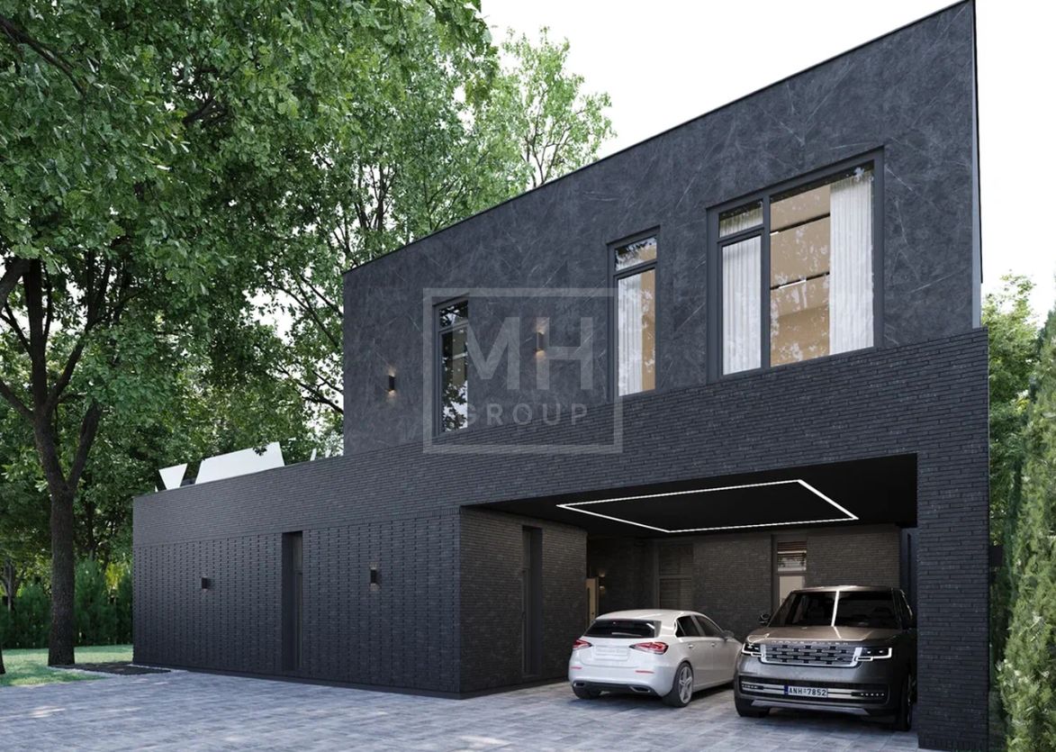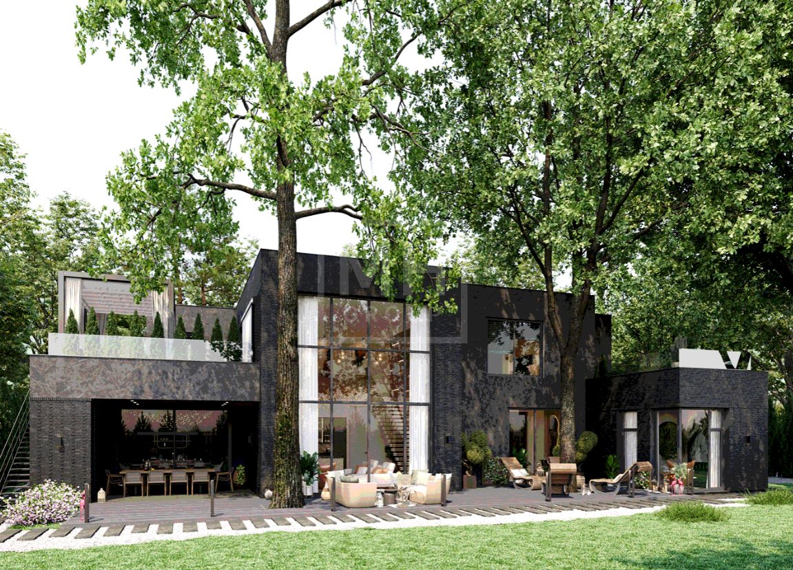 Стильный современный дом с плоской кровлей, облицованный уникальным ригельным кирпичом, с большой кухней-столовой-гостиной со вторым светом, 4 спальнями, кабинетом, СПА-блоком, полной дизайнерской отделкой, “парящей” лестницей, дровяным камином, 4 террасами в одну из которых интегрировано 2 живых величественных дуба.