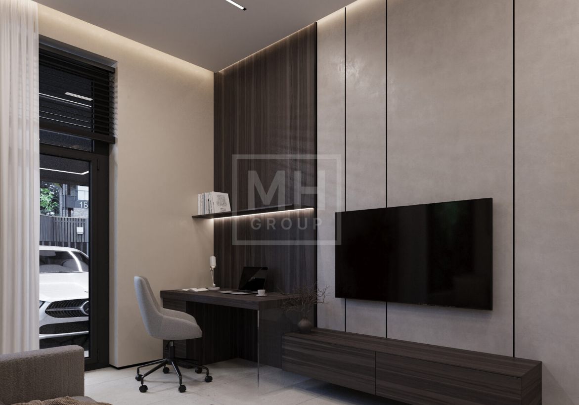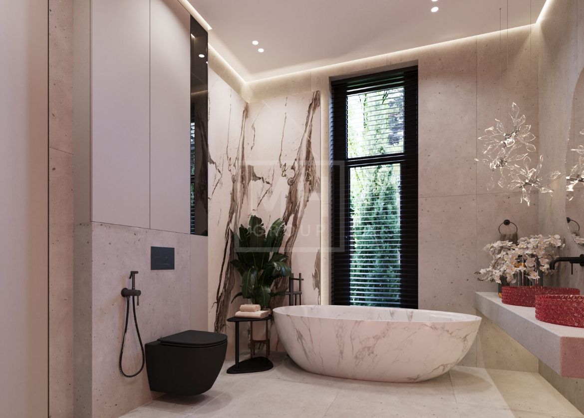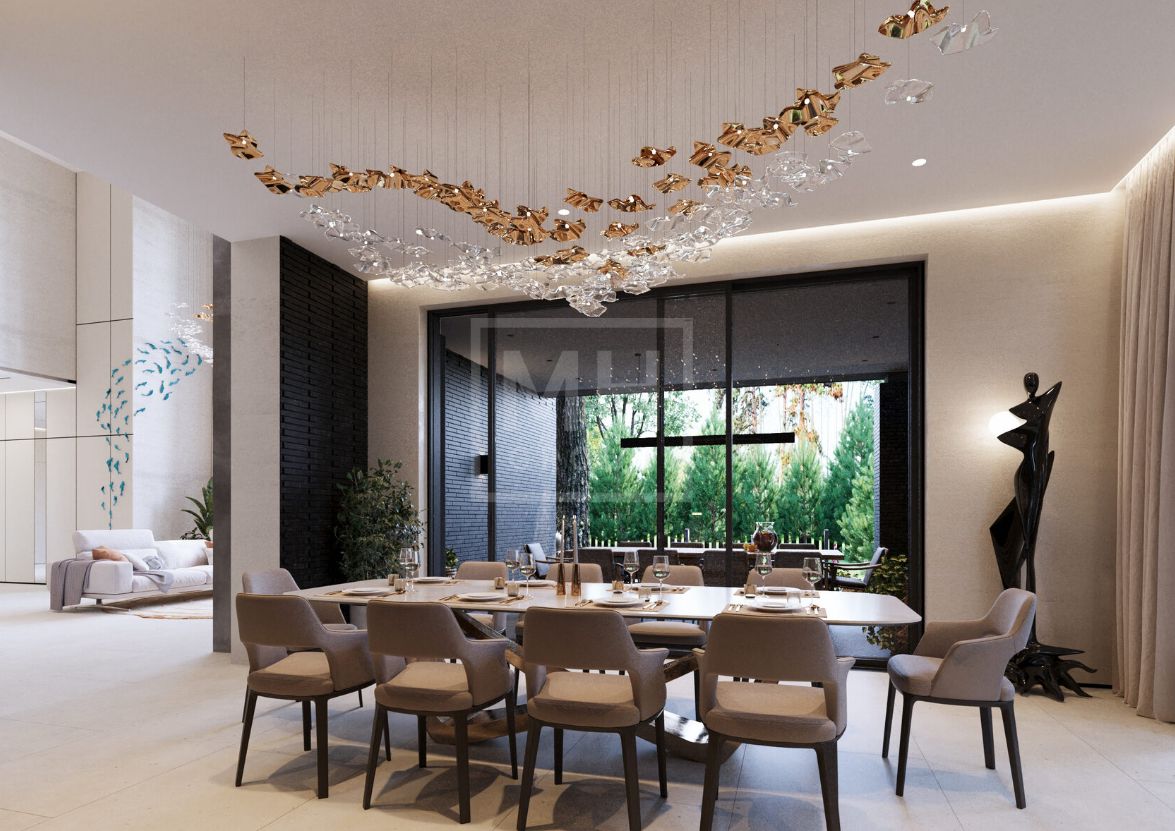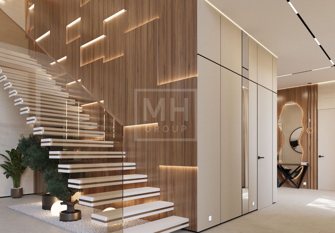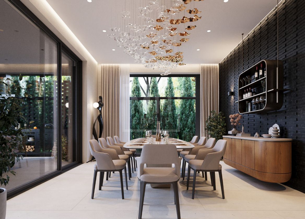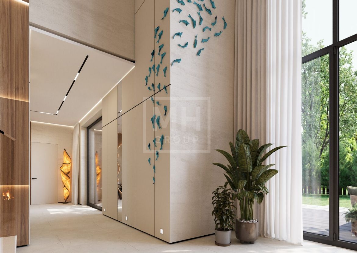 Стильный современный дом с плоской кровлей, облицованный уникальным ригельным кирпичом, с большой кухней-столовой-гостиной со вторым светом, 4 спальнями, кабинетом, СПА-блоком, полной дизайнерской отделкой, “парящей” лестницей, дровяным камином, 4 террасами в одну из которых интегрировано 2 живых величественных дуба.