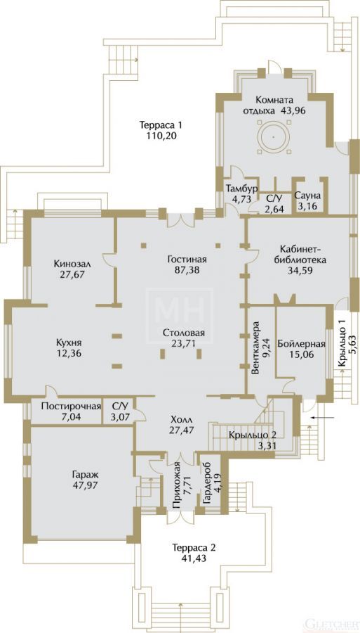 Этаж 1: Холл, прихожая, с/у, кухня, профессиональная кухня, столовая, гостиная, кабинет, с/у, 2 гардеробные, постирочная