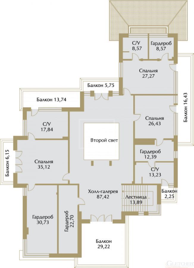 Этаж 2: 2 холла с выходами на балконы, 4 спальни с гардеробными, ванными комнатами и балконами.