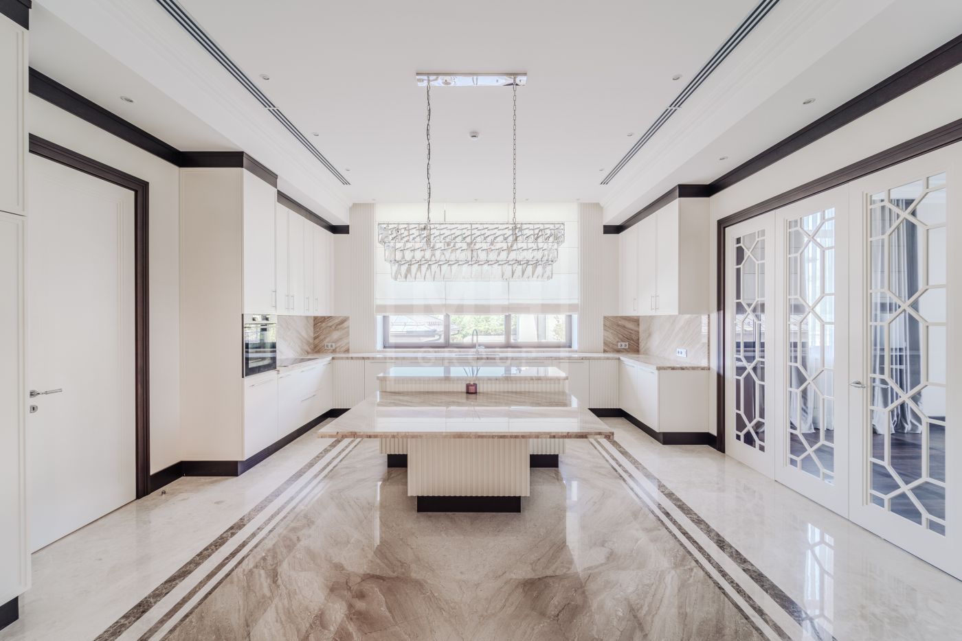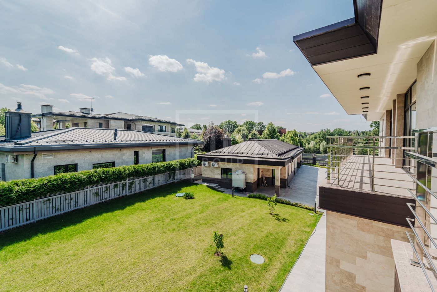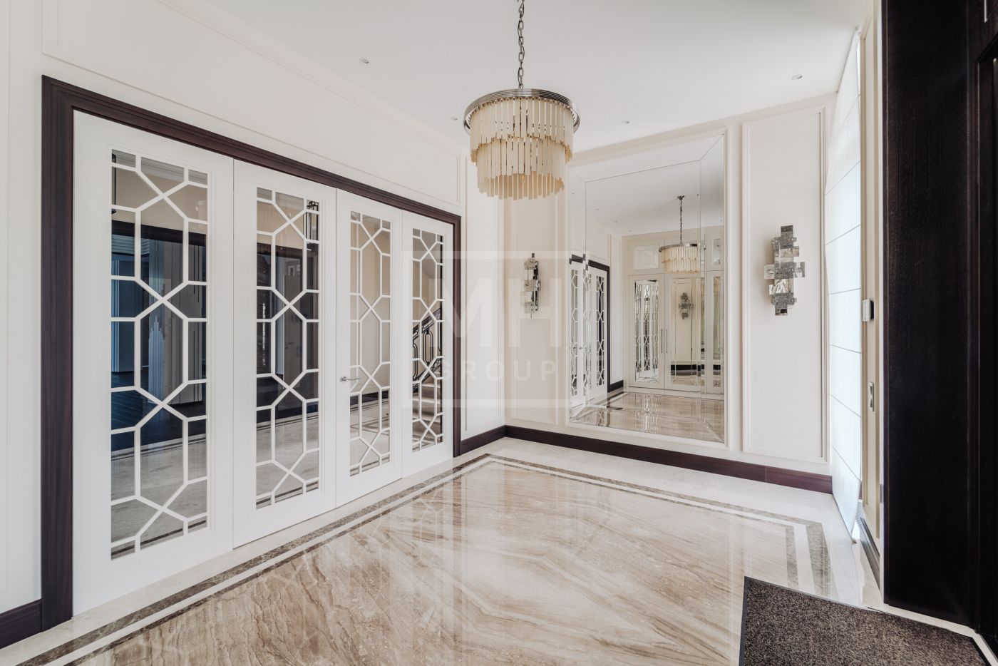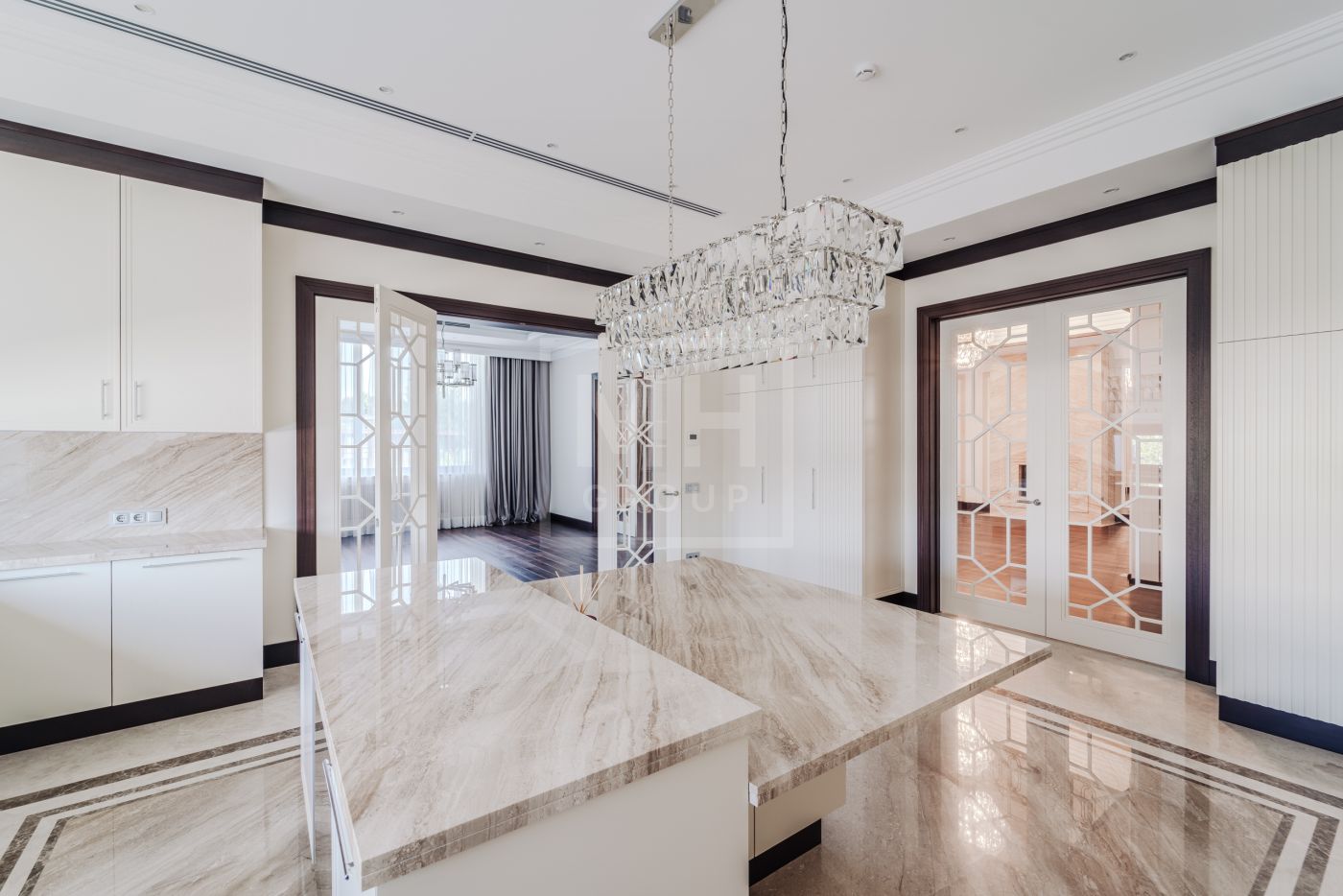Новый дом с отделкой под ключ, выполнен в современном ар-деко, что придало интерьеру уверенного композиционного прочтения мейнстрима "Олд мани". Фактурные колонны, огромные зеркала, распашные двери с орнаментом, второй свет в гостиной, натуральные дерево и камень, хрустальные люстры нарочито больших размеров и т.д. Основная цветовая гамма контраст белого или кремового с венге. Продуманная, комфортная планировка оставит приятное впечатление.В отдельное одноэтажное строение вынесены второстепенные помещения: гараж на 3 авто, блок для персонала, кладовые и котельная.
