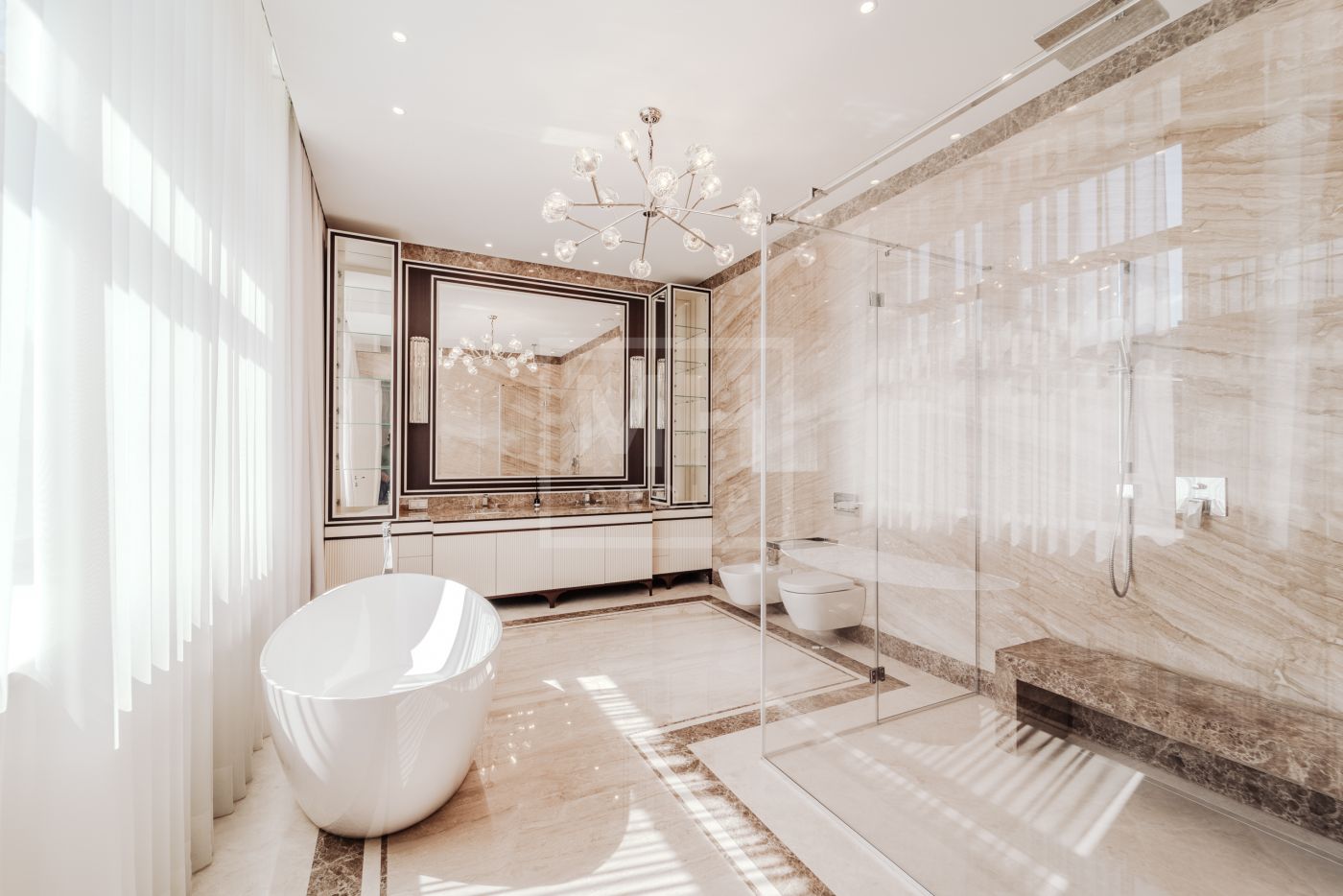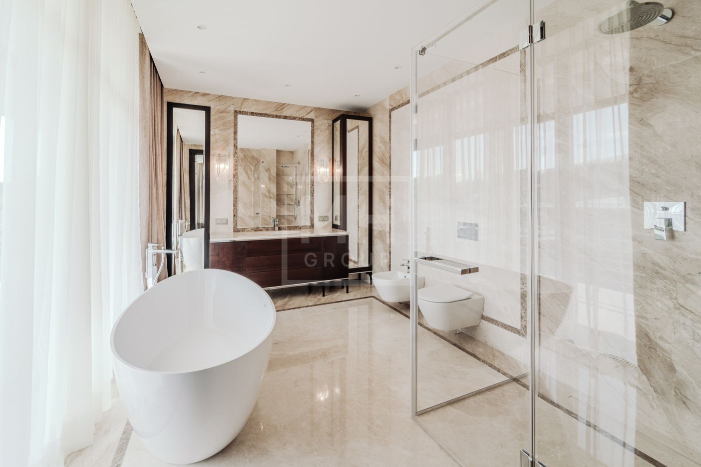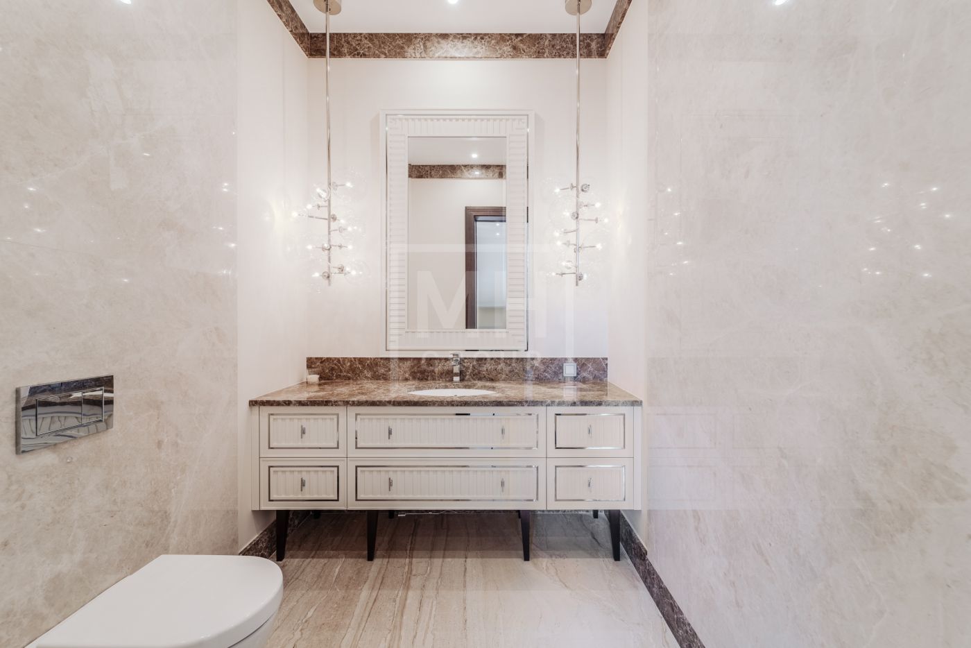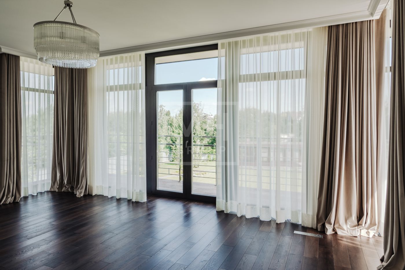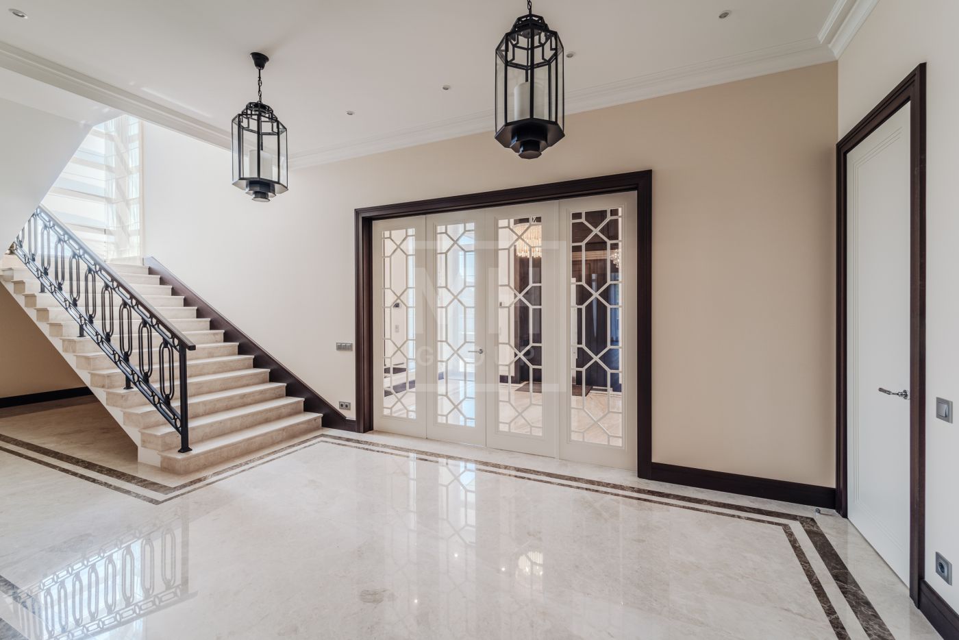 Новый дом с отделкой под ключ, выполнен в современном ар-деко, что придало интерьеру уверенного композиционного прочтения мейнстрима "Олд мани". Фактурные колонны, огромные зеркала, распашные двери с орнаментом, второй свет в гостиной, натуральные дерево и камень, хрустальные люстры нарочито больших размеров и т.д. Основная цветовая гамма контраст белого или кремового с венге. Продуманная, комфортная планировка оставит приятное впечатление.В отдельное одноэтажное строение вынесены второстепенные помещения: гараж на 3 авто, блок для персонала, кладовые и котельная.