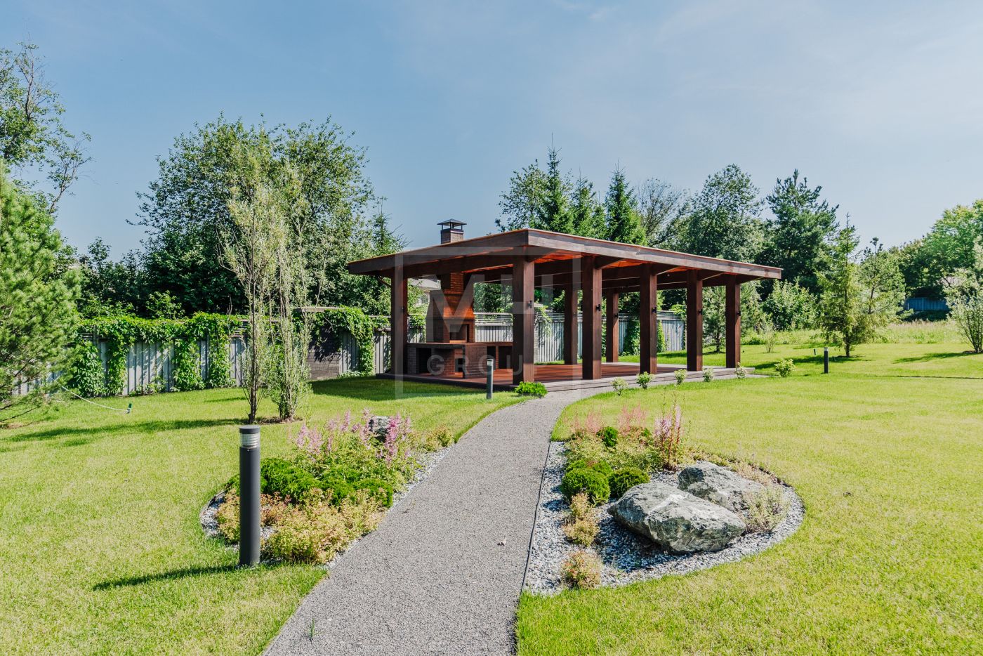 На участке выполнены ландшафтные работы: мощение, подсветка, газон, высажены деревья, кустарники и цветы; построена беседка с мангальной зоной.