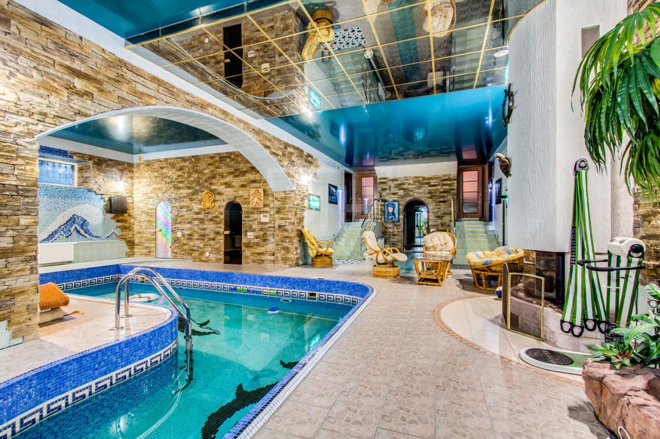 Цоколь: зона отдыха с камином, бассейн 8 м., сауна, душевая с с/у котельная.