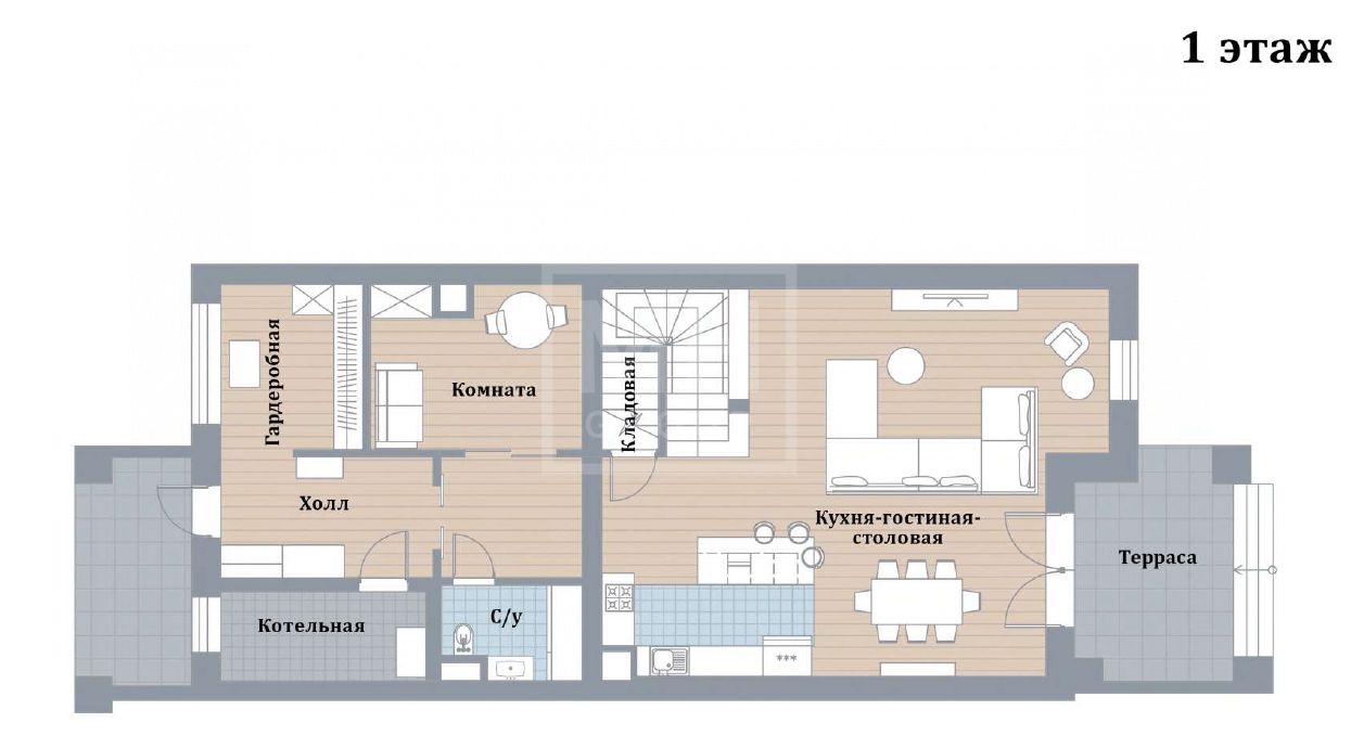 Этаж 1: Прихожая, гардеробная, с/у, небольшая спальня, кухня-столовая-гостиная