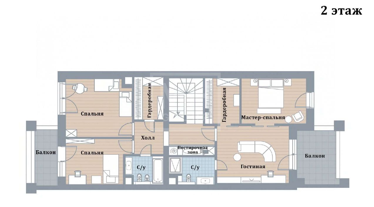 Этаж 2: Мастер спальня с гостиной, гардеробной и с/у, 2 спальни, с/у, зона постирочной