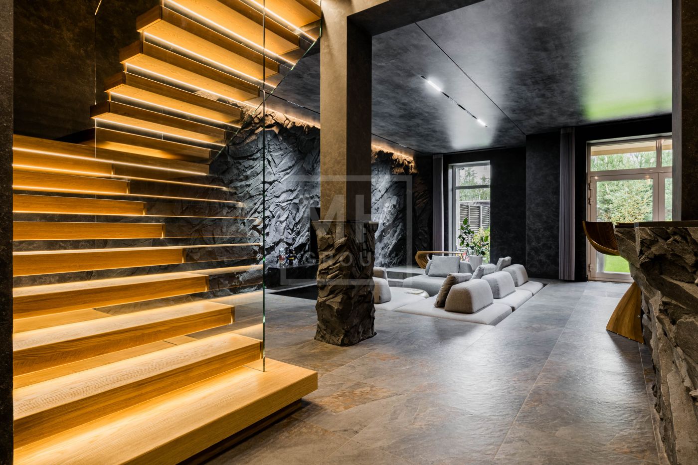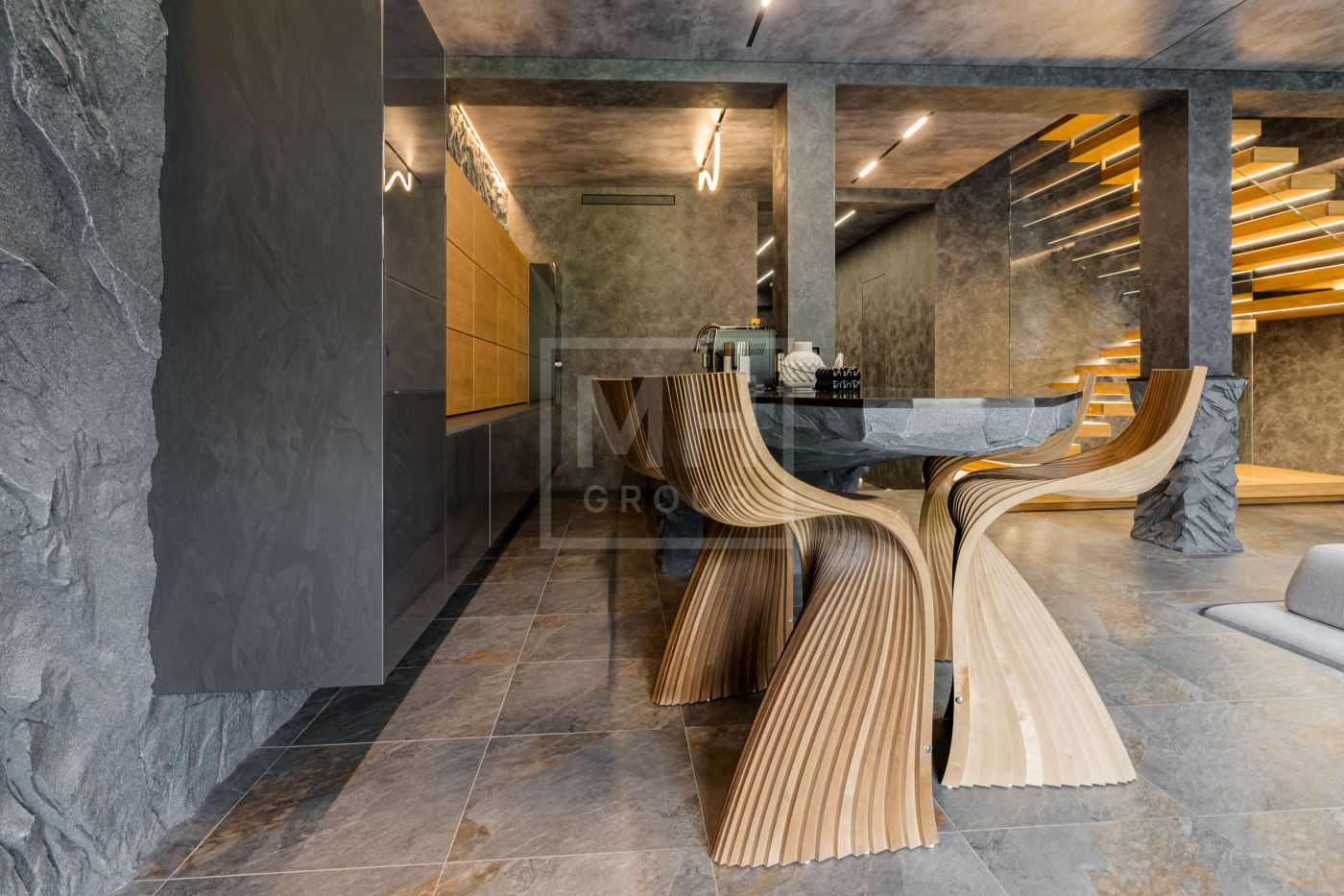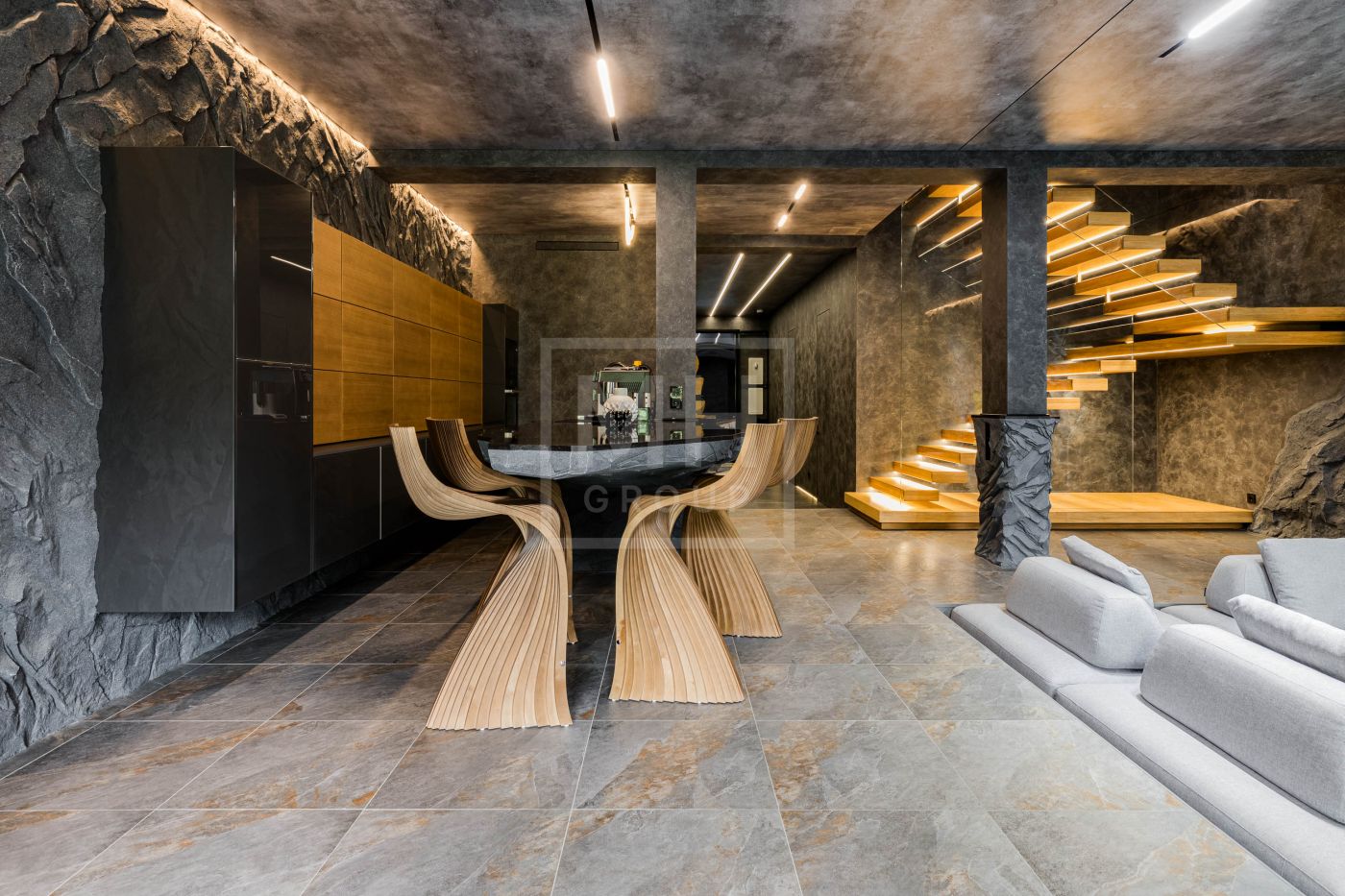 Этаж 1: Парадный холл, кухня-столовая-гостиная с выходом на террасу для семейных ужинов и камерных приёмов, гостевая спальня, гардеробная, санузел, котельная-постирочная (Miele).