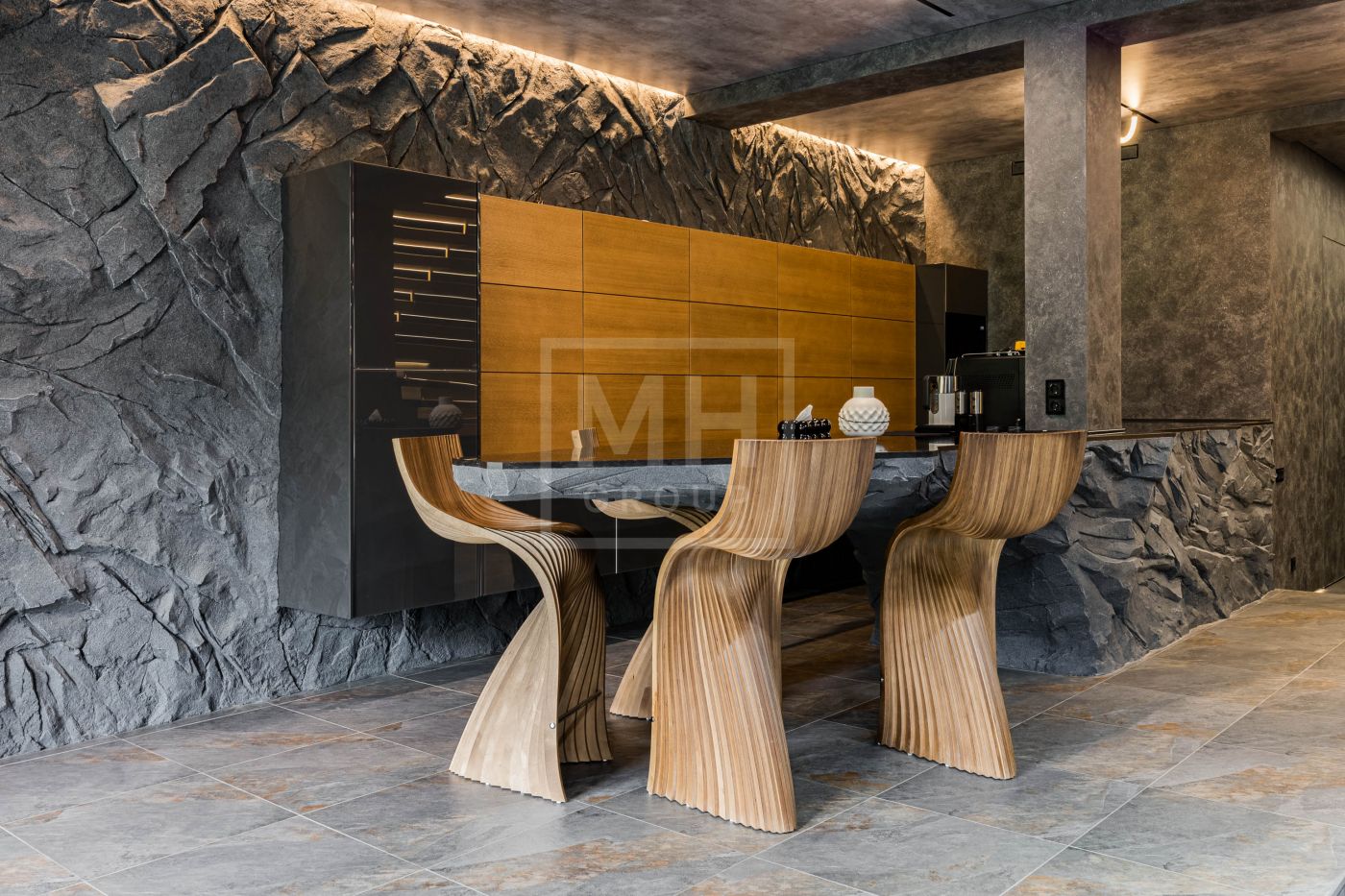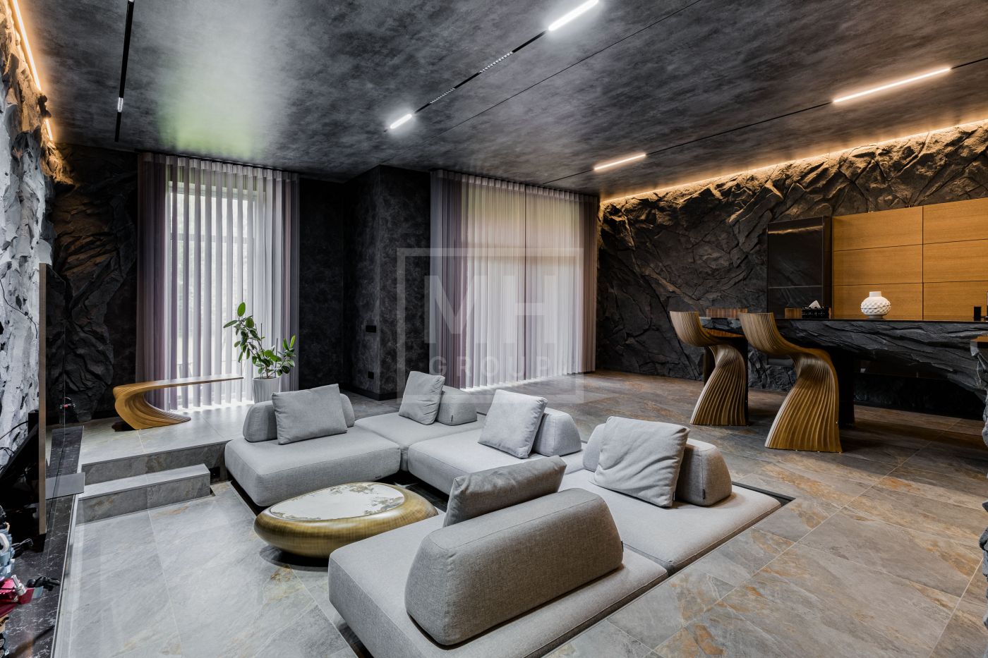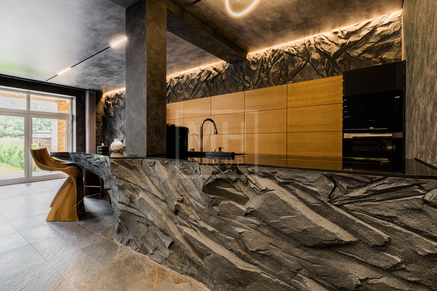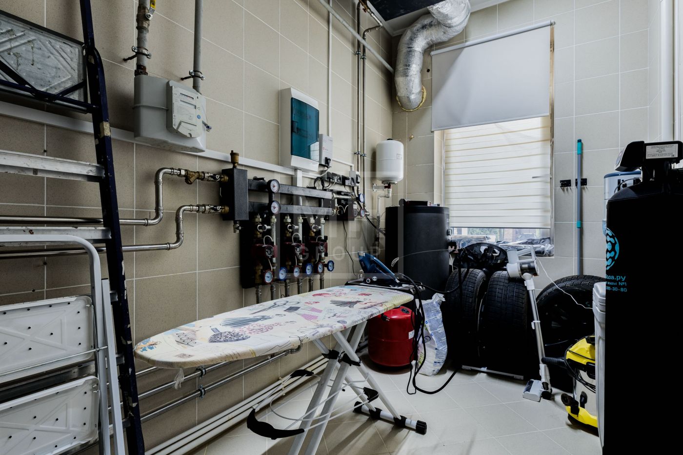 Этаж 1: Парадный холл, кухня-столовая-гостиная с выходом на террасу для семейных ужинов и камерных приёмов, гостевая спальня, гардеробная, санузел, котельная-постирочная (Miele).